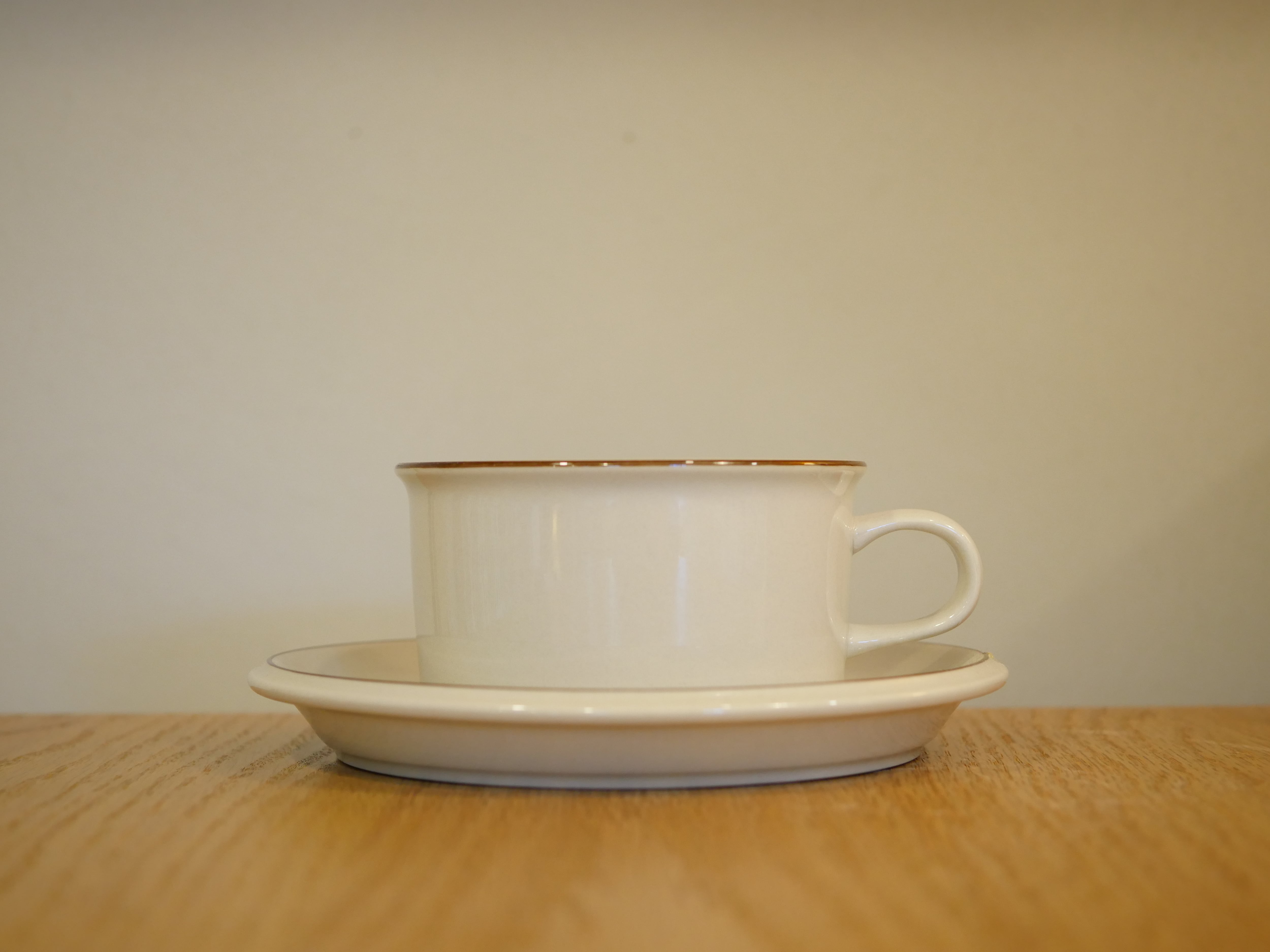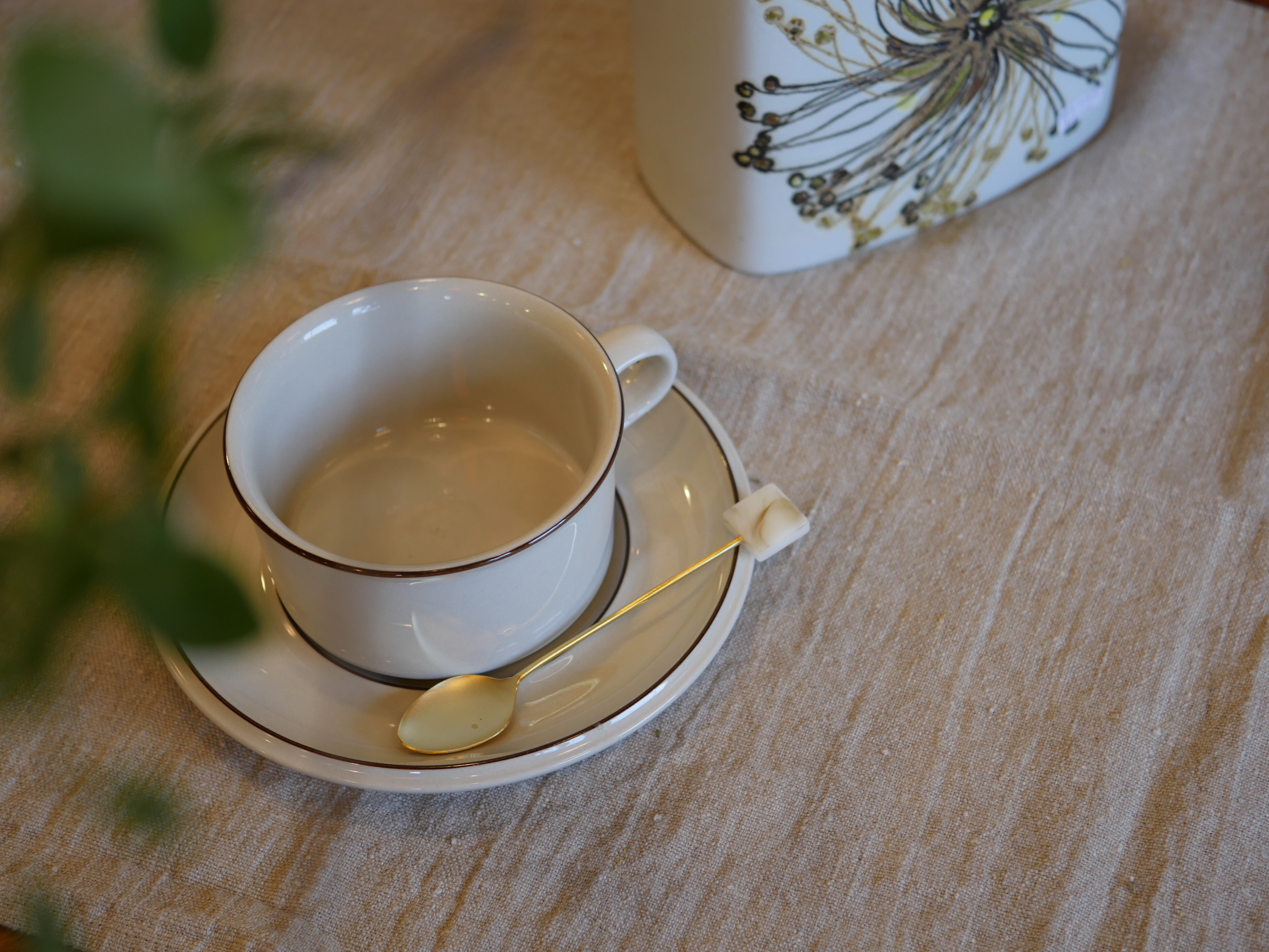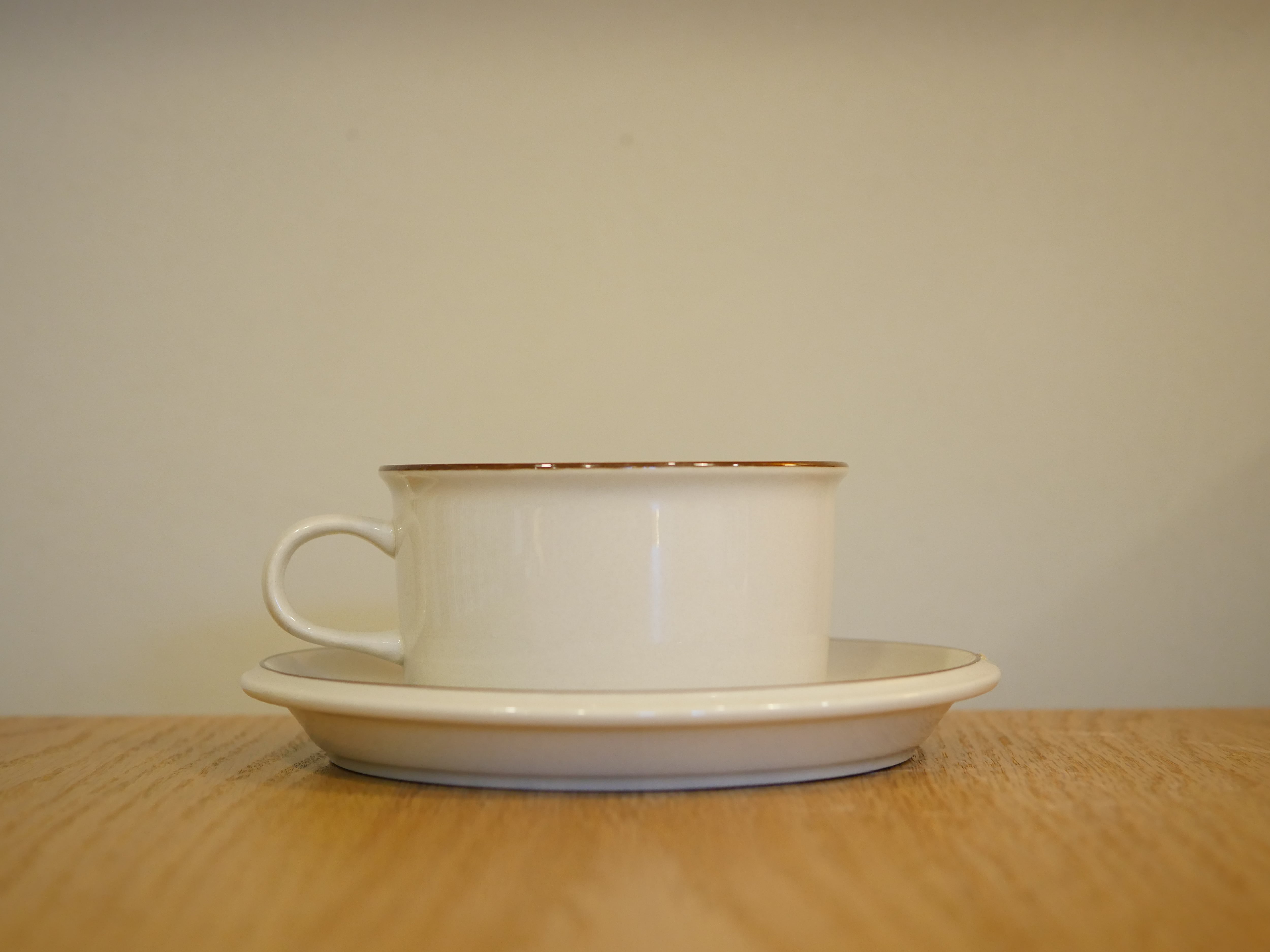 ラテン語でフィンランドを意味するこちらは淡いグレーに細いブラウンのラインだけでデザインされています。フィンランドの冬のように土の上に積もるたくさんの雪をイメージされているかのようです。とてもシンプルなデザインはどの食卓にも馴染み、自然と手に取りたくなる作品です。こちらは大きめのティーカップサイズです。