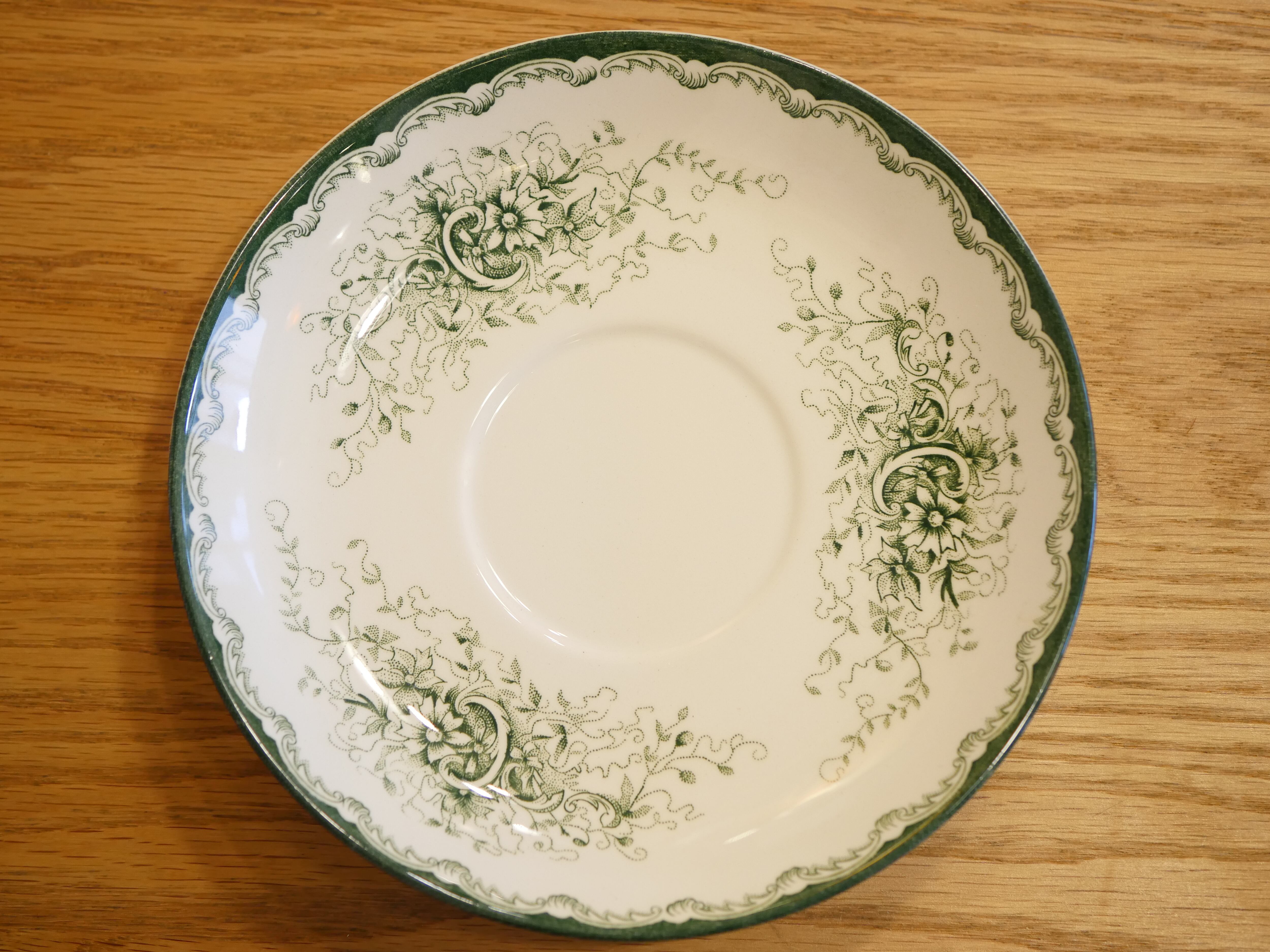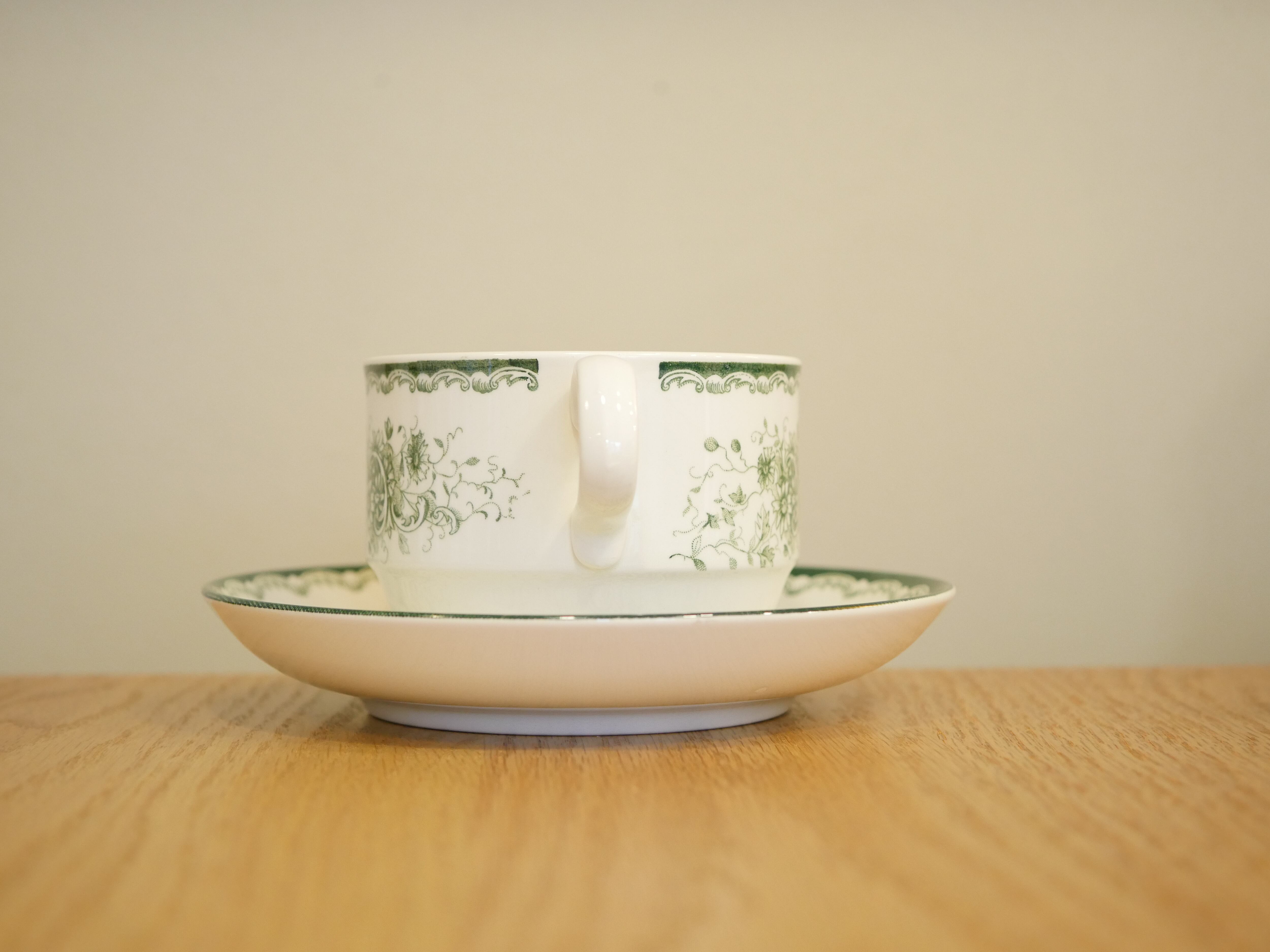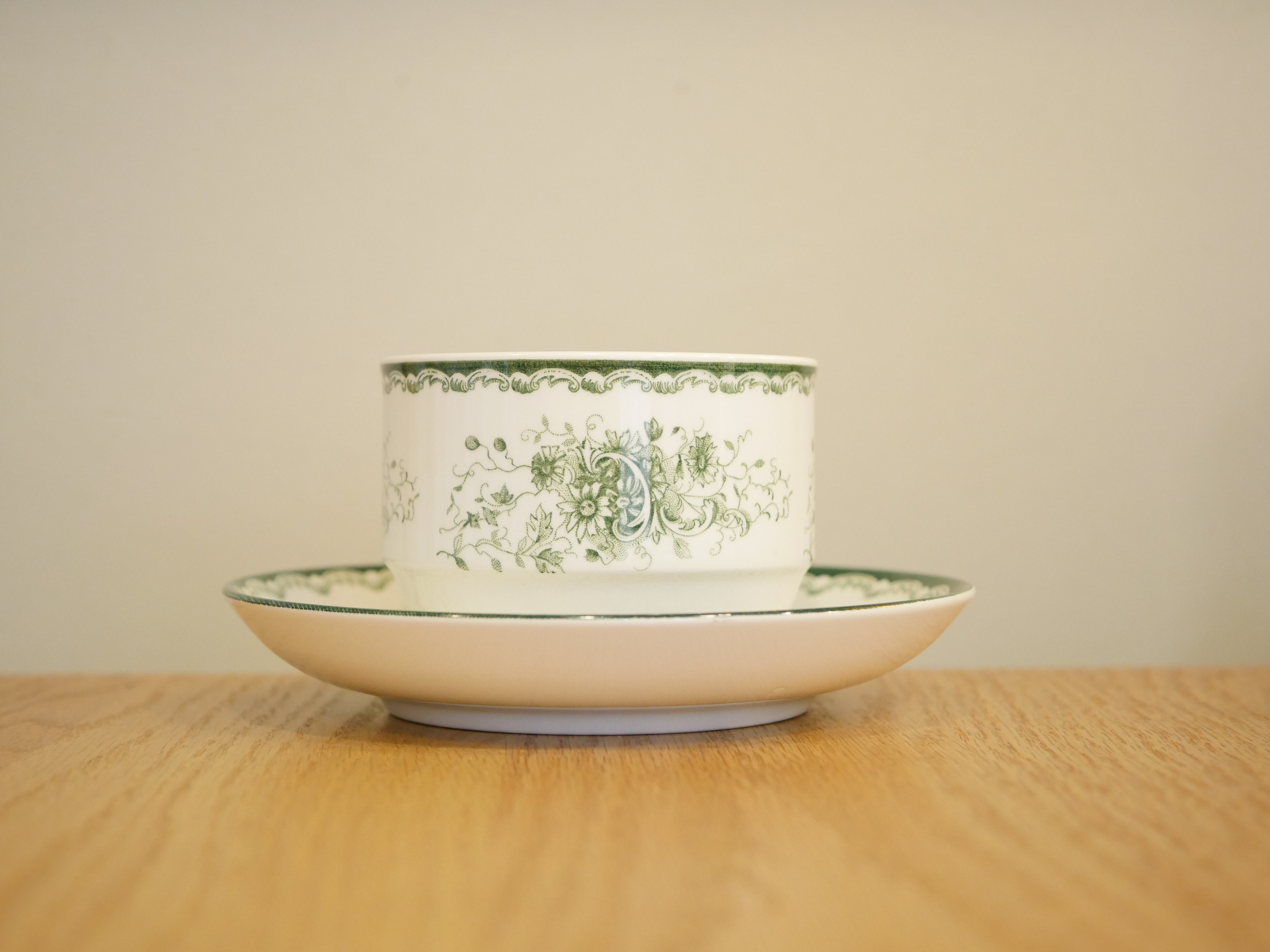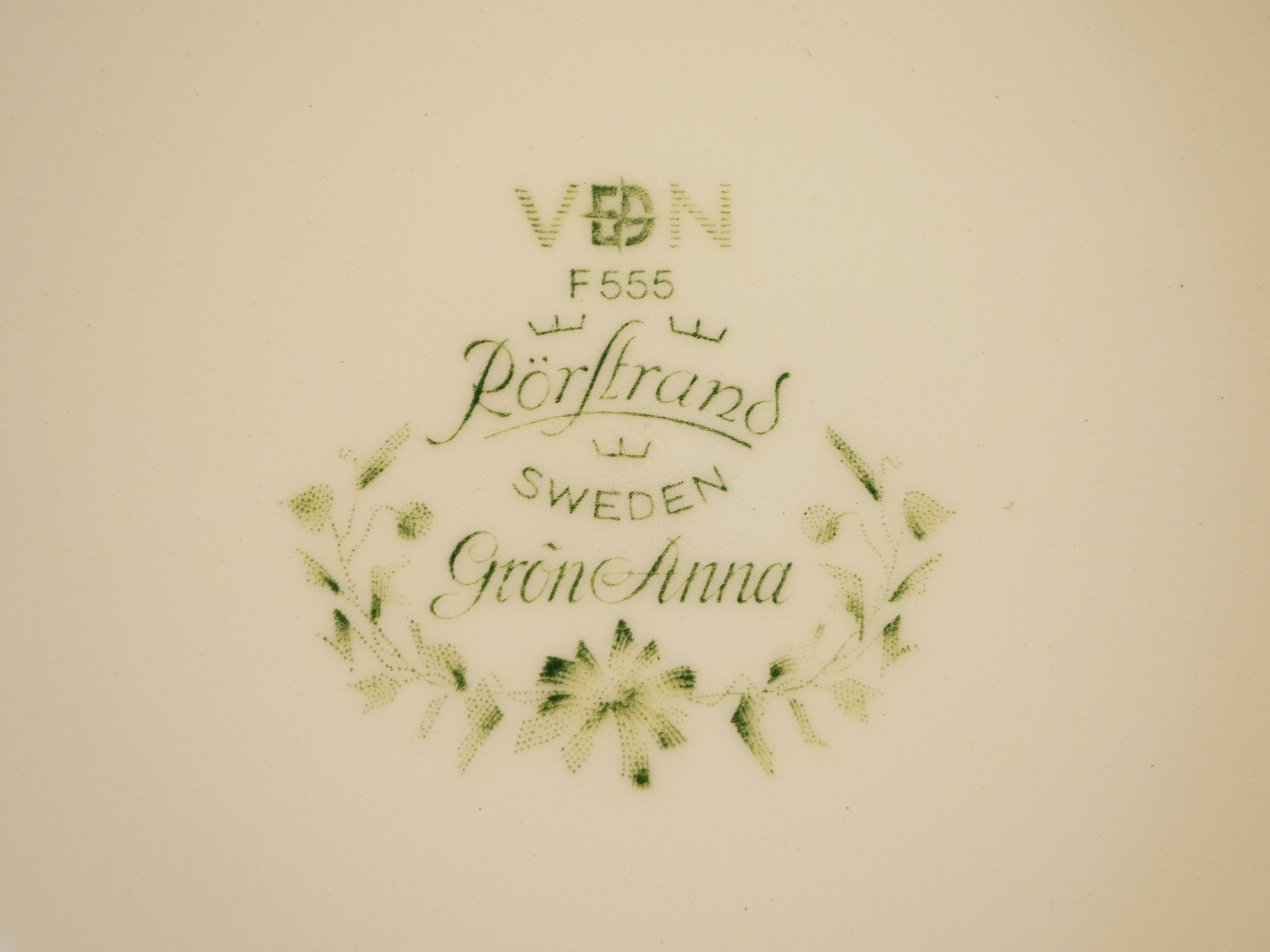 Gron Annaは1898-2002年と休止期間を途中2回挟みますが非常に長くスウェーデンの人に愛されたデザインです。オフホワイトにグリーンの装飾。カラーリングはシンプルですが、クラシカルで繊細な植物や花のデコレーションがカップにもソーサーにも満遍なく施され、女性的で上品なデザインです。こちらはティーカップサイズと容量大きく、同型であれば綺麗にスタッキングも可能です。バックスタンプにVDN(消費者センターのようなもの)とあり、こちらのマークは使用した期間が1951−1973年の間なのでこのカップもその時に作られたものだと思われます。