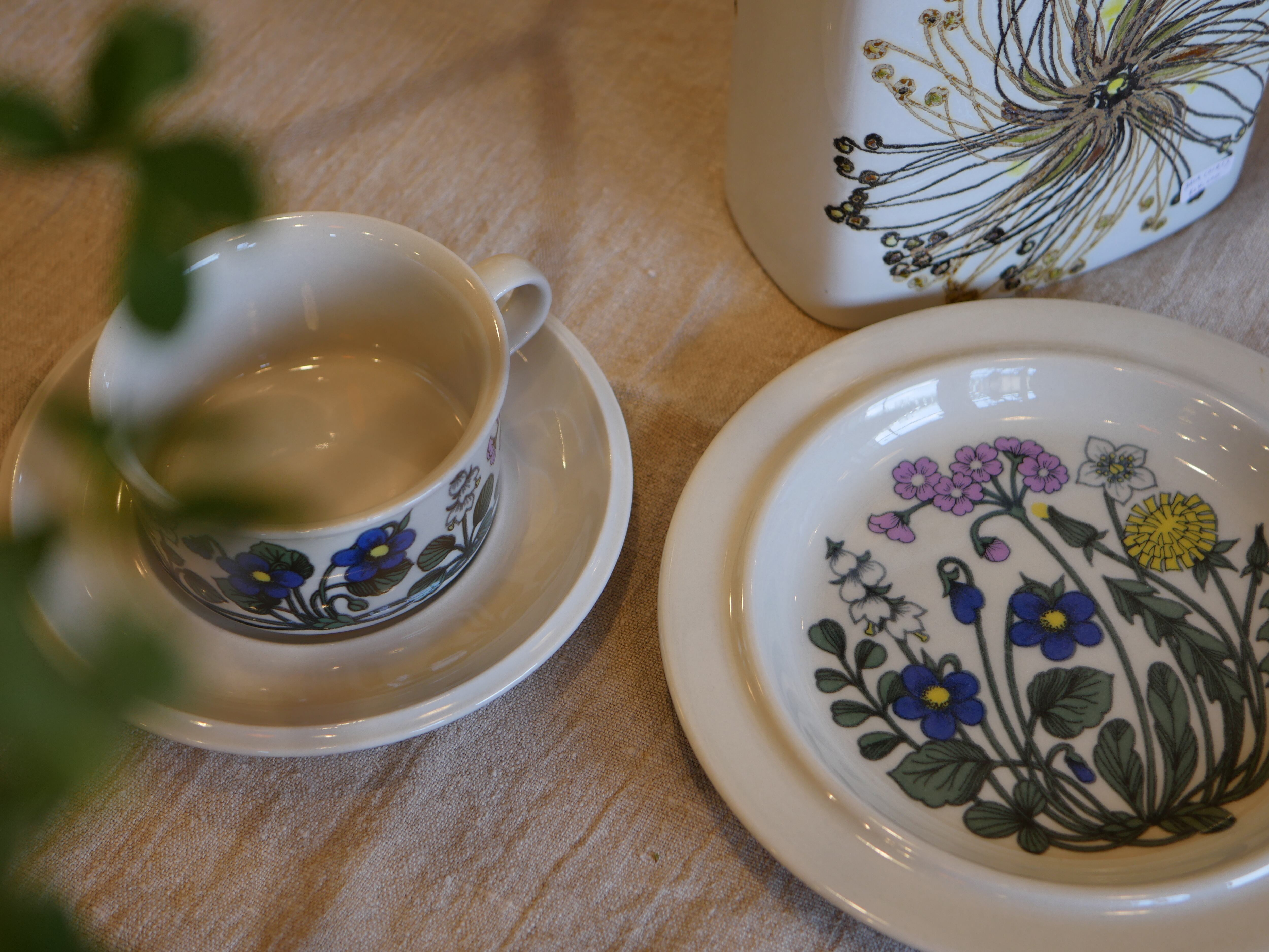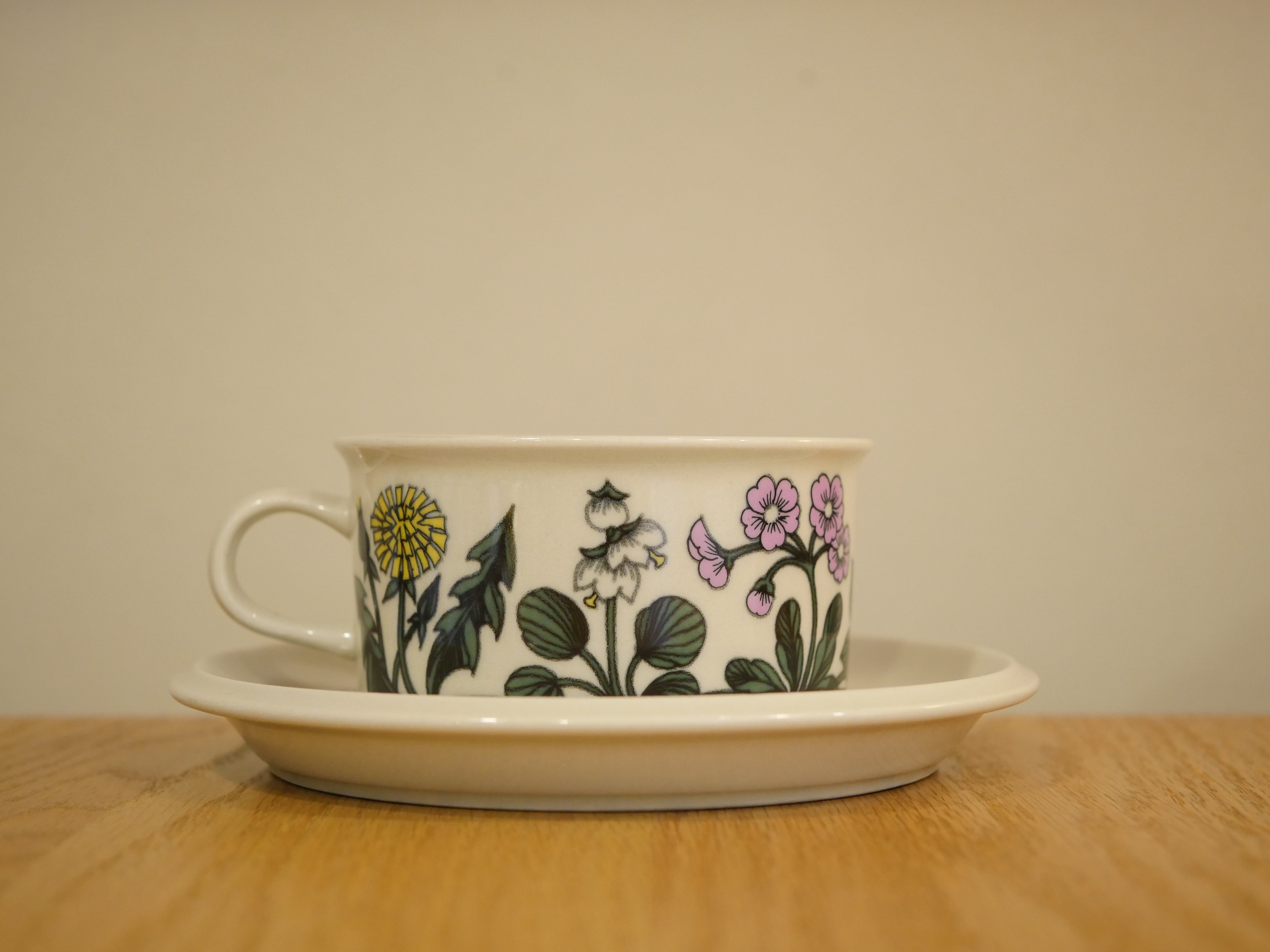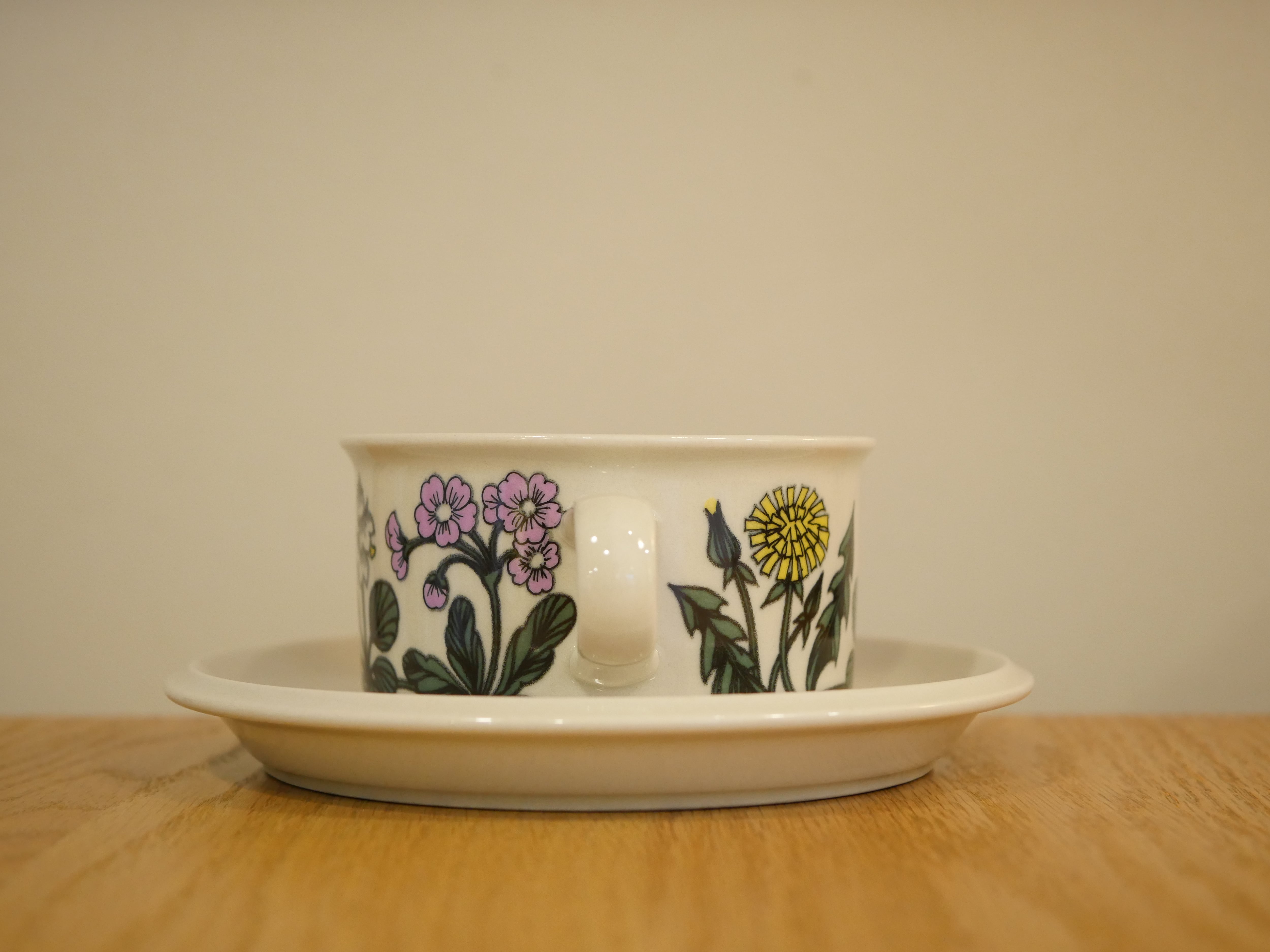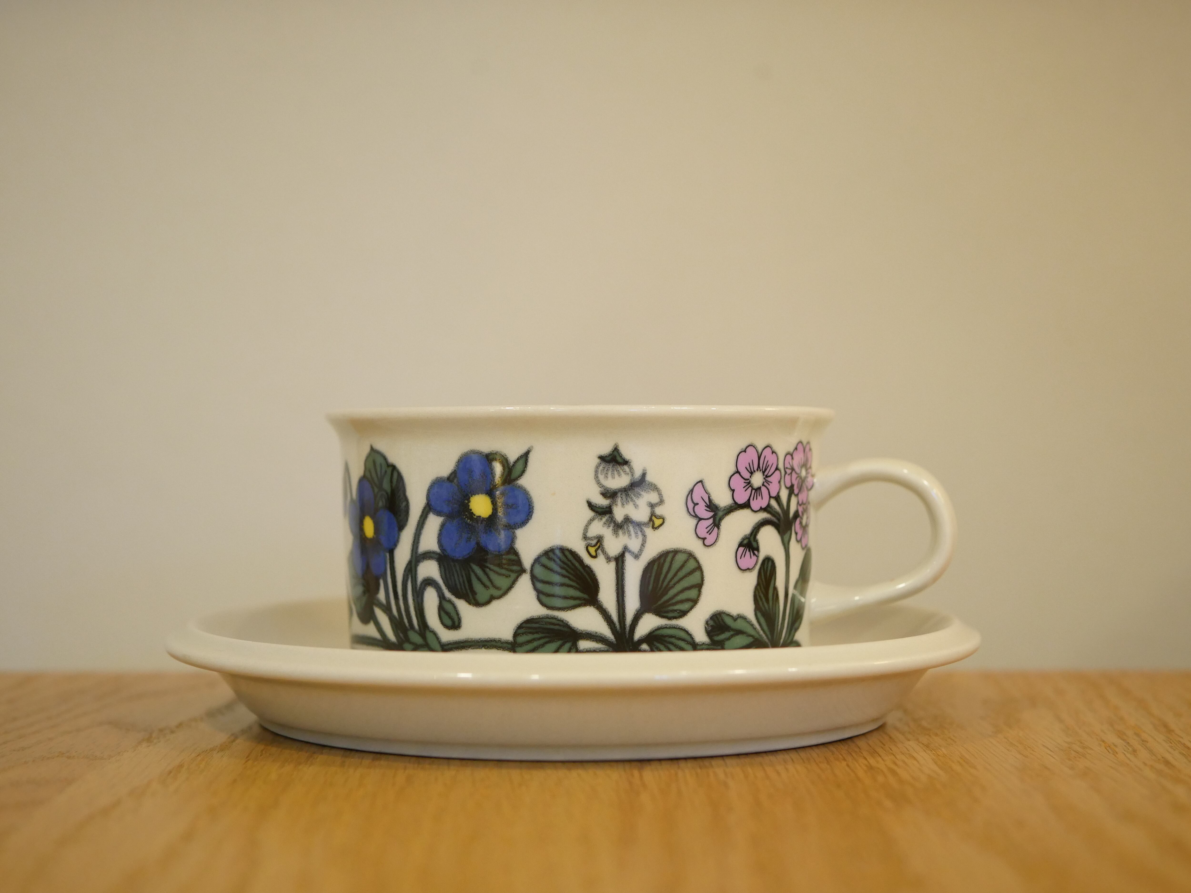 フィンランドにあるアラビア社のフローラシリーズ。タンポポ・サクラソウ・スズラン・スミレなど素朴な花々が色とりどりに描かれたフローラ。やや太めのタッチから自然の中で咲く生き生きとした野草と、待ちきれない春への強い想いを感じます。オリジナルのバックスタンプにもご注目ください。製造年数が3年と短いため、人気が高く手に入りにくい作品です。こちらは大きめのティーカップサイズです。