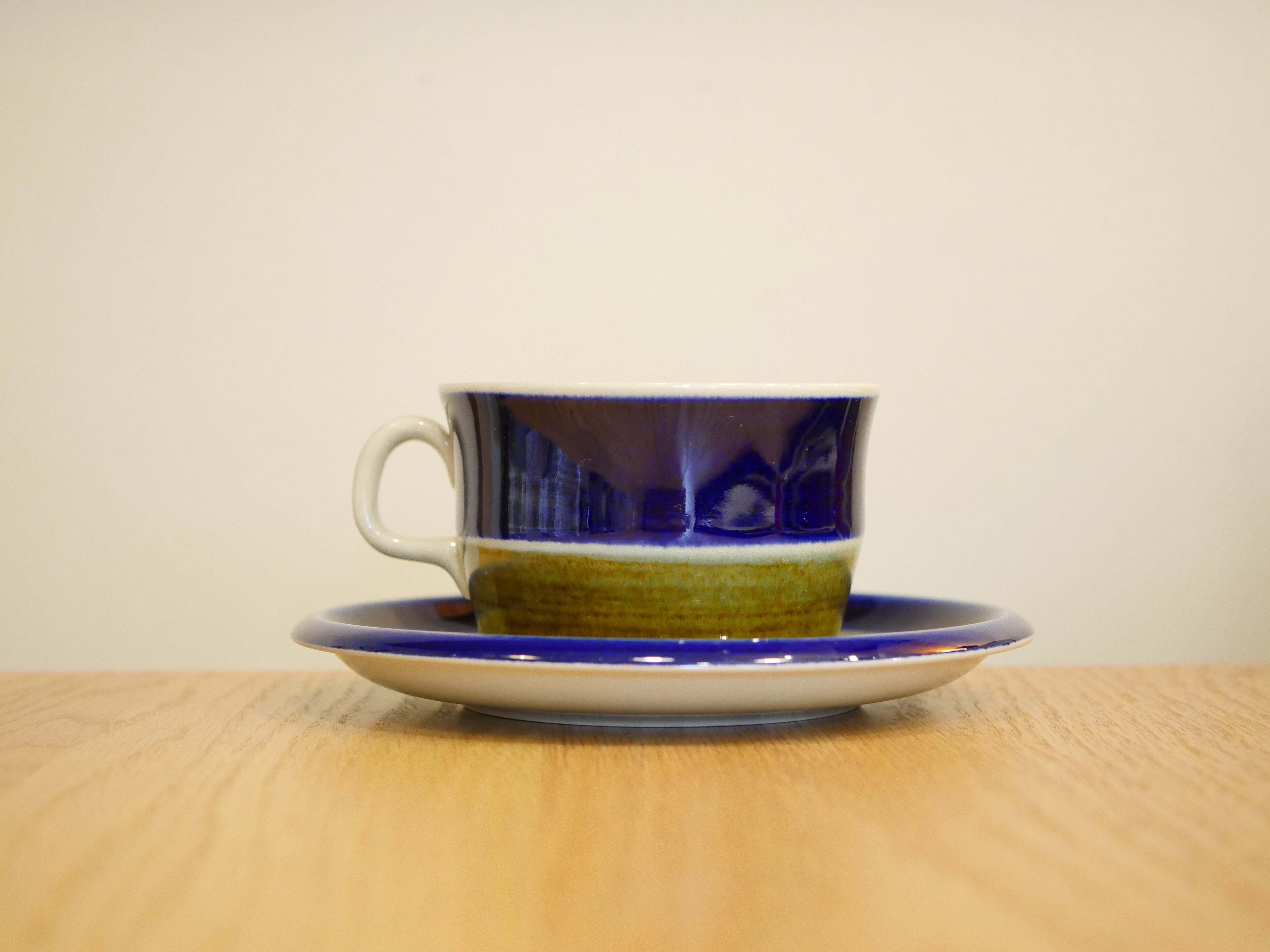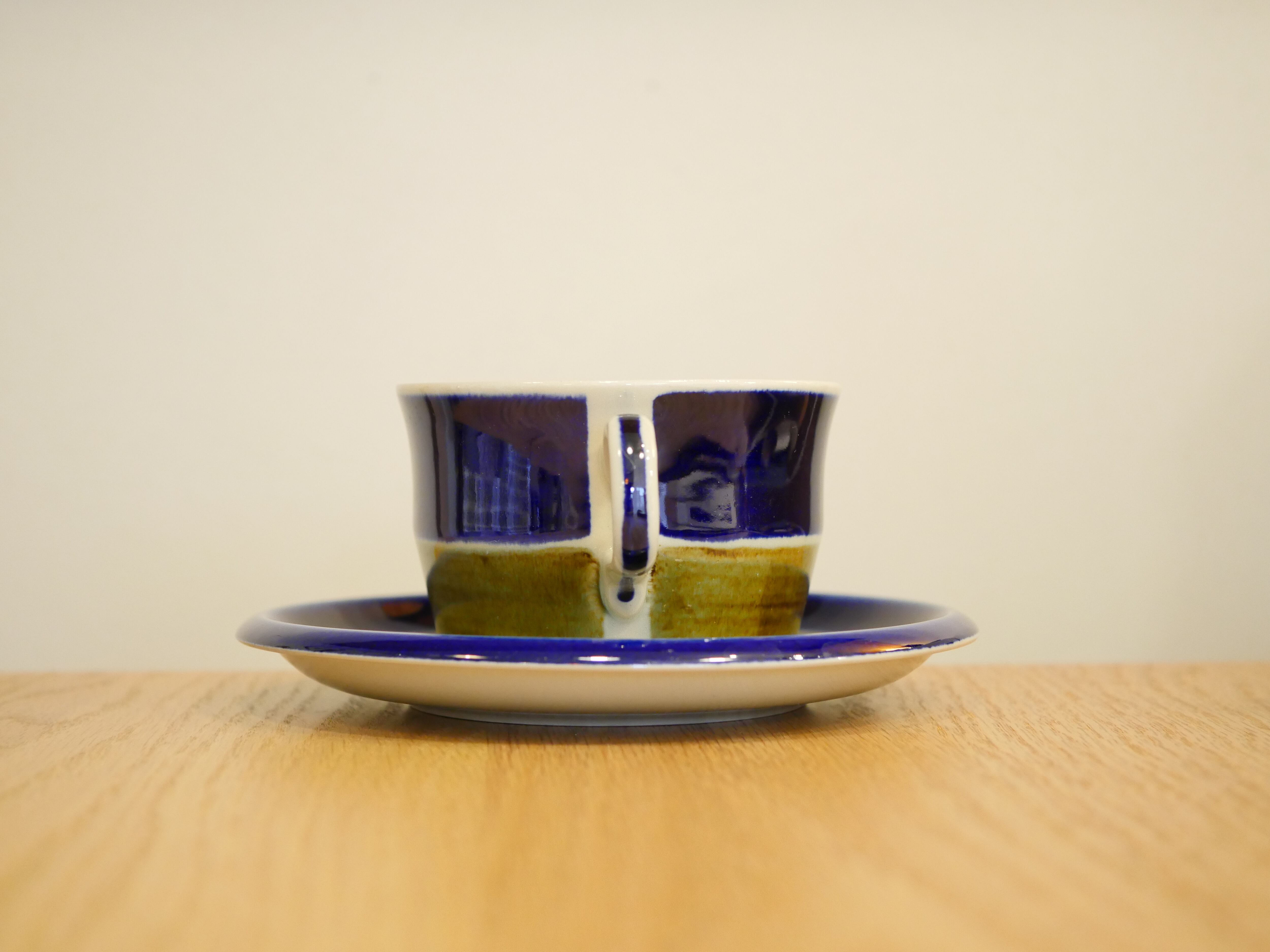 グレーをベースとし、深みのある藍色と濃いモスグリーンのハンドペイントがやわらかく落ち着いた印象を与えます。とろりとした釉薬に丸みのあるフォルムはどこか可愛らしさがあり、どこかマリアンヌ・ウエストマンらしさがあります。シンプルなデザインであっても、長い年月を経てもいつまでも愛される魅力がある作品です。