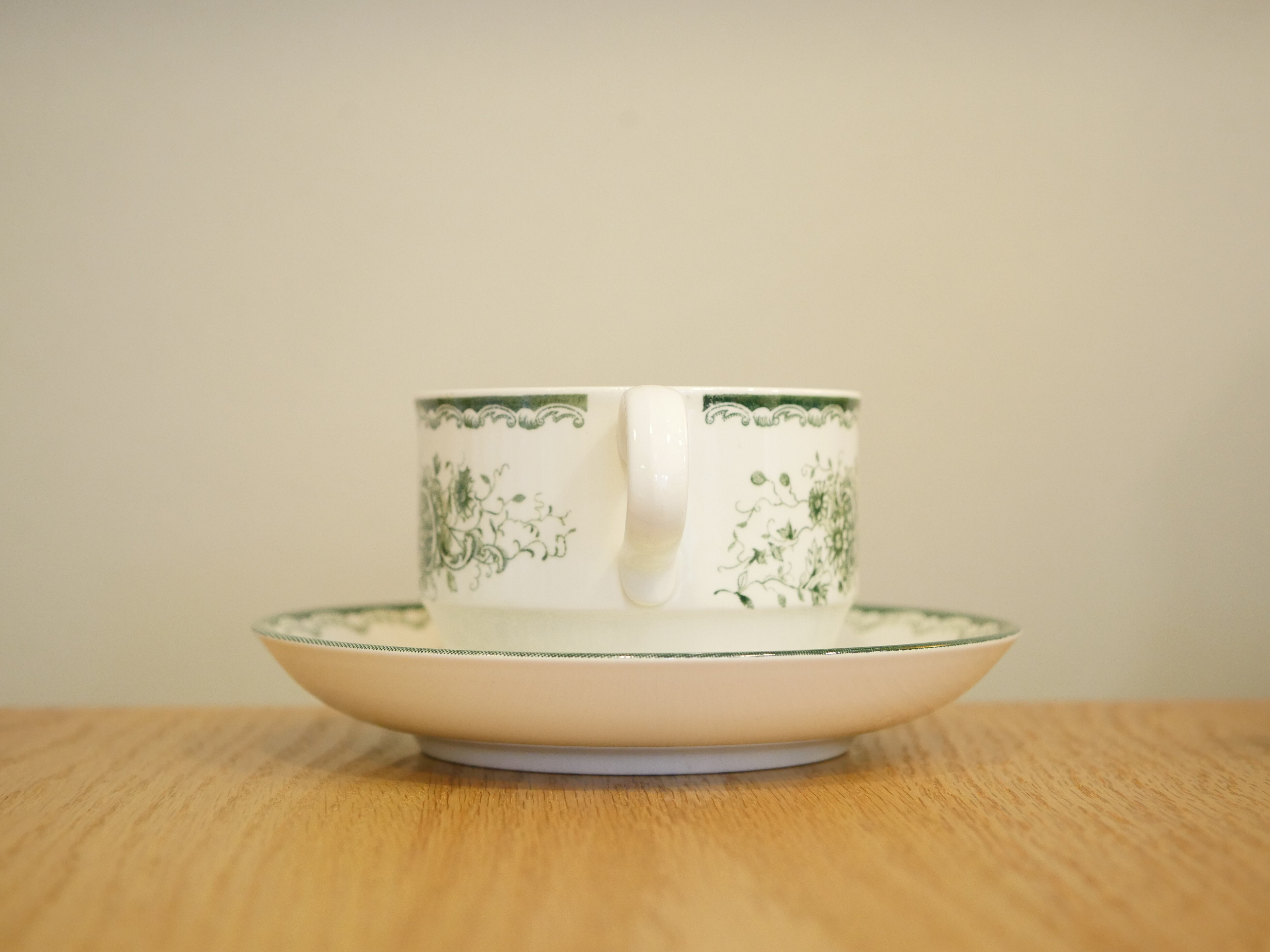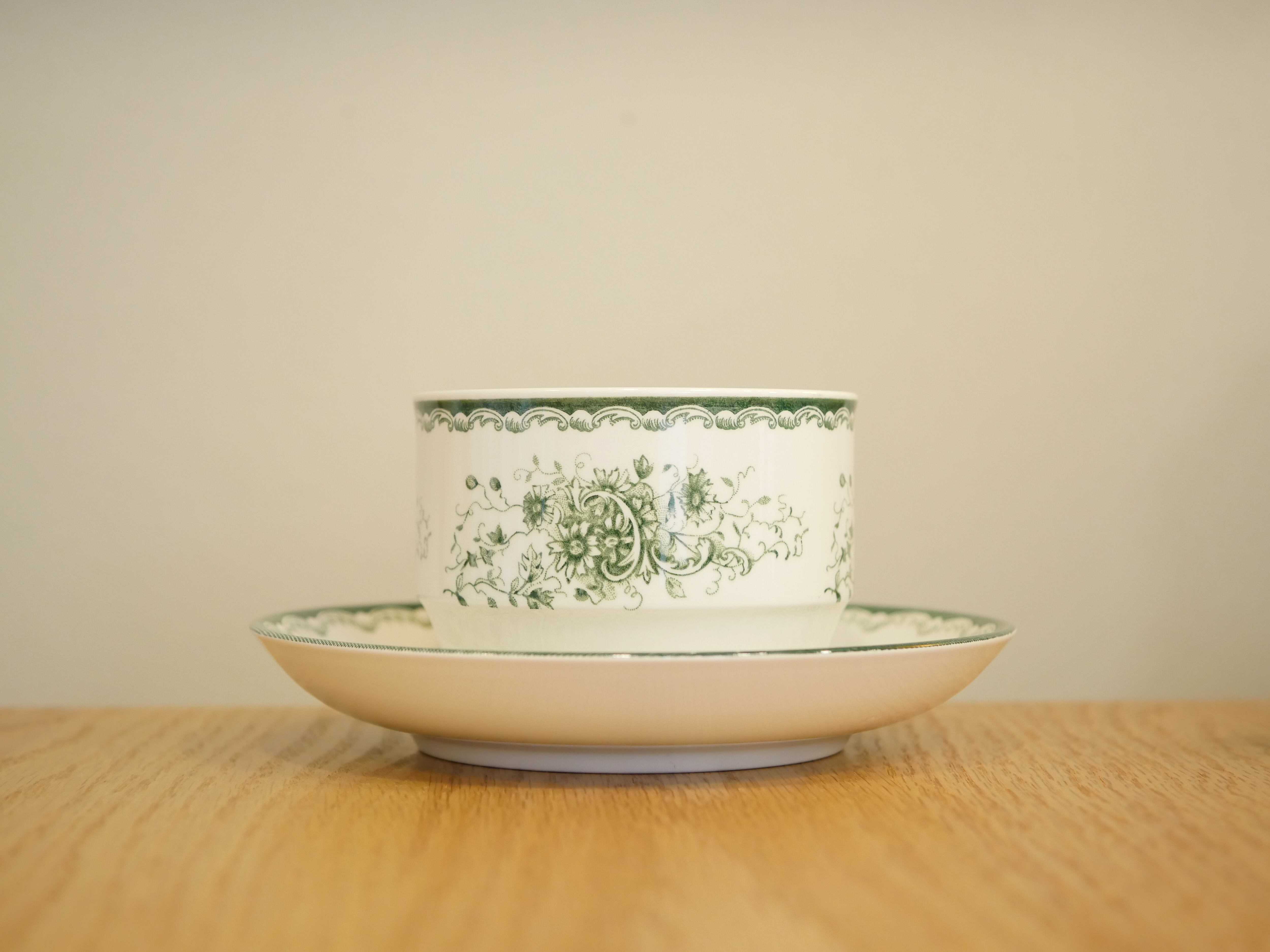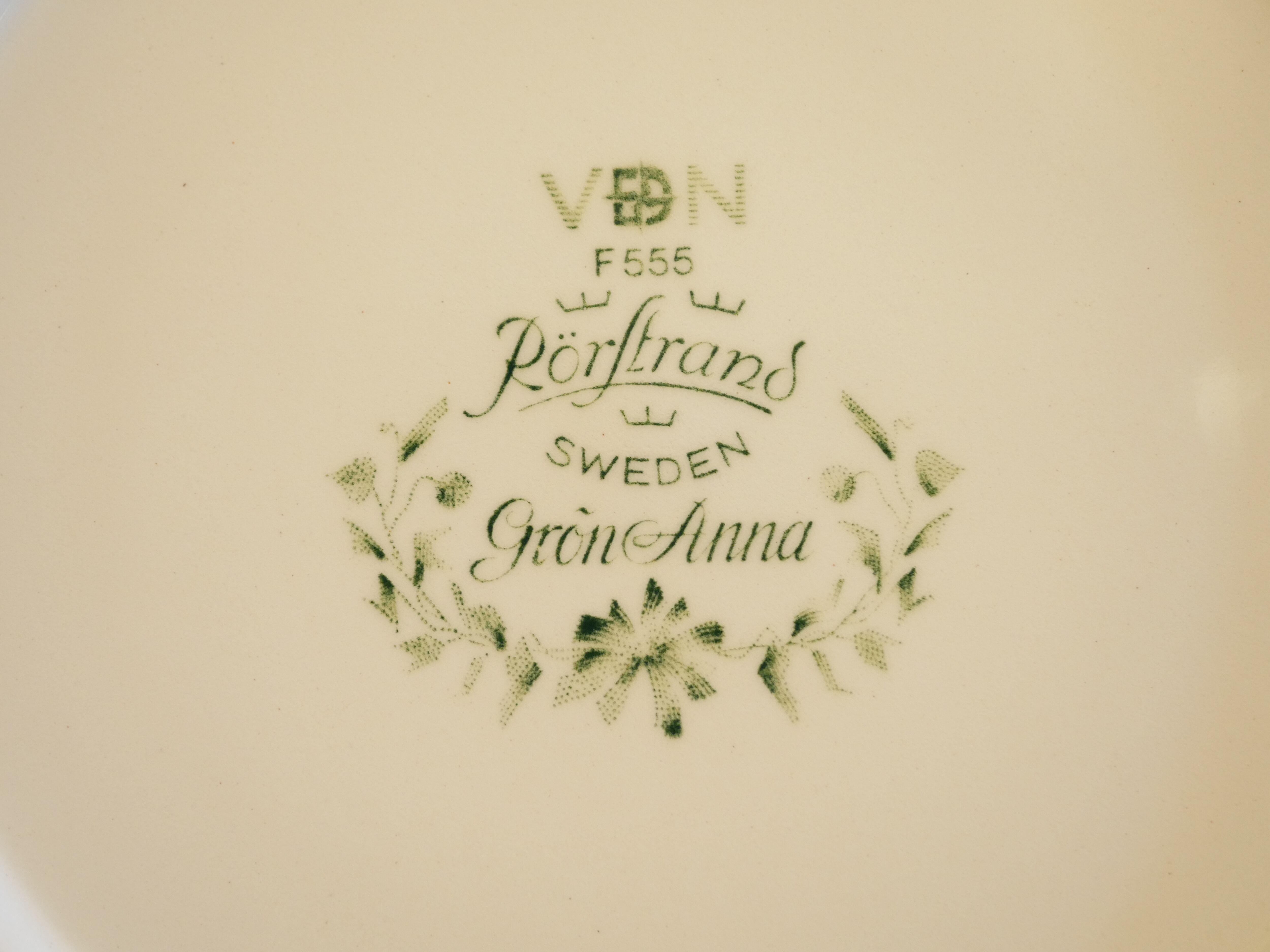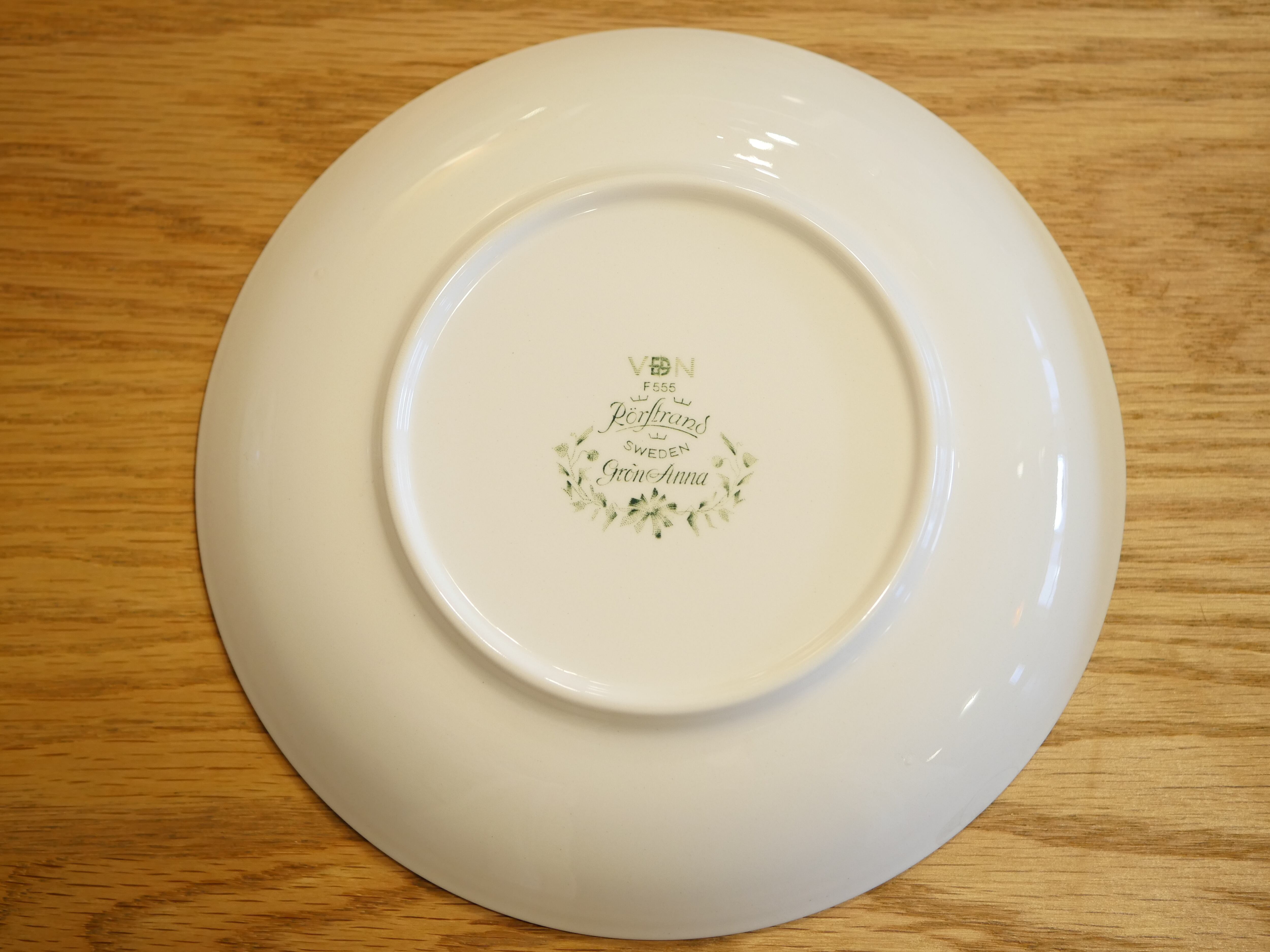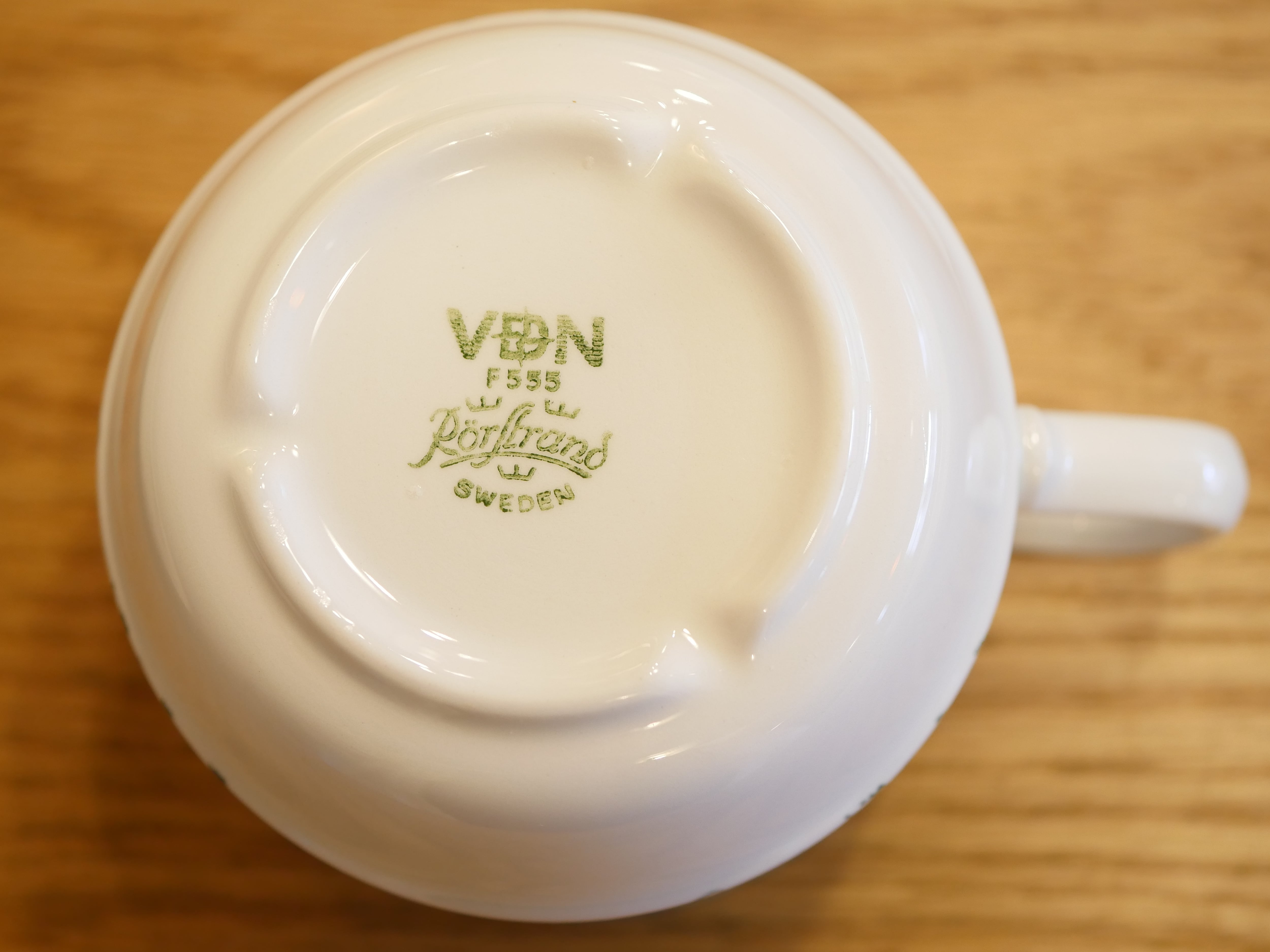 Gron Annaは1898-2002年と休止期間を途中2回挟みますが非常に長くスウェーデンの人に愛されたデザインです。オフホワイトにグリーンの装飾。カラーリングはシンプルですが、クラシカルで繊細な植物や花のデコレーションがカップにもソーサーにも満遍なく施され、女性的で上品なデザインです。こちらはティーカップサイズと容量大きく、同型であれば綺麗にスタッキングも可能です。バックスタンプにVDN(消費者センターのようなもの)とあり、こちらのマークは使用した期間が1951−1973年の間なのでこのカップもその時に作られたものだと思われます。