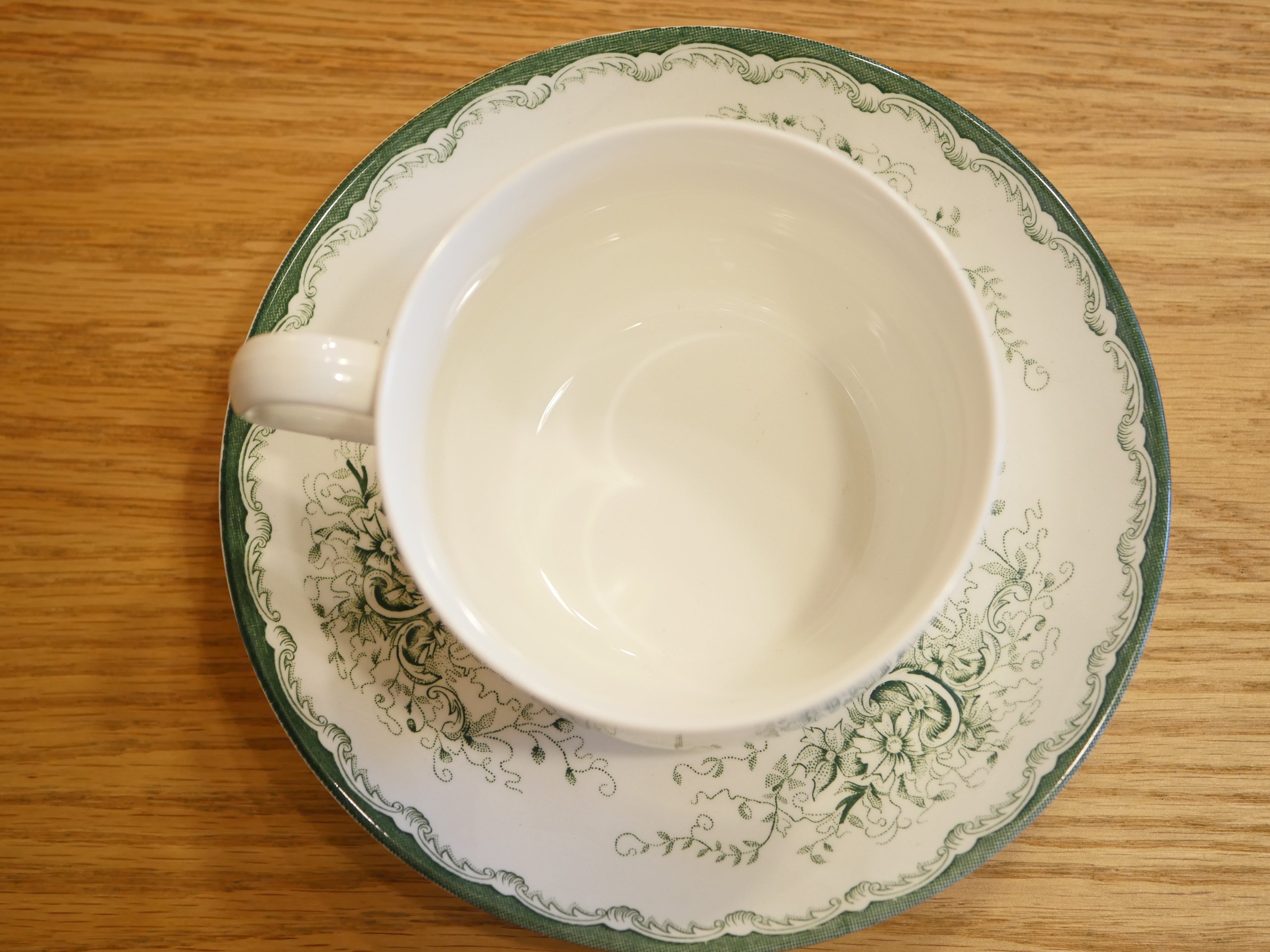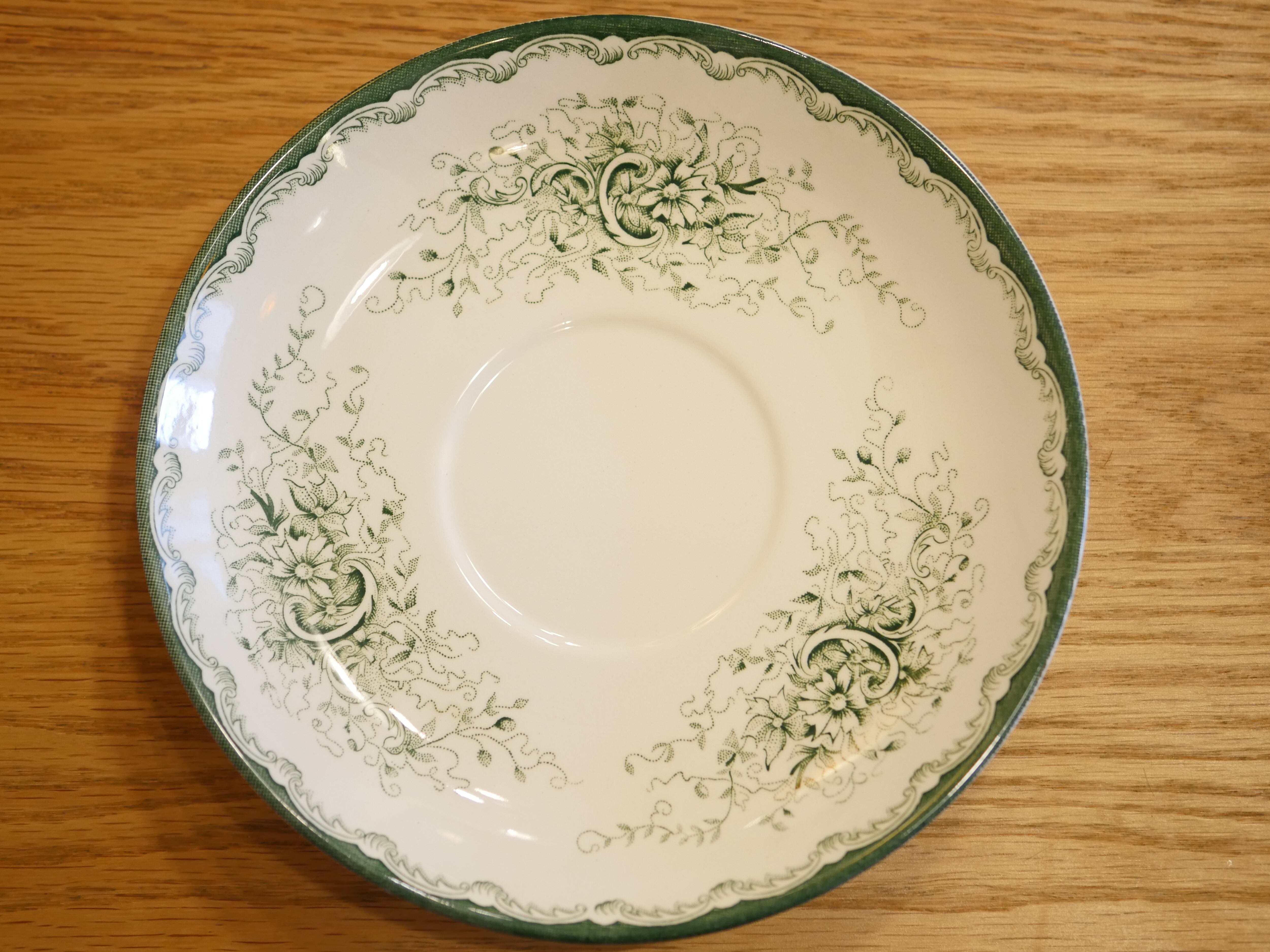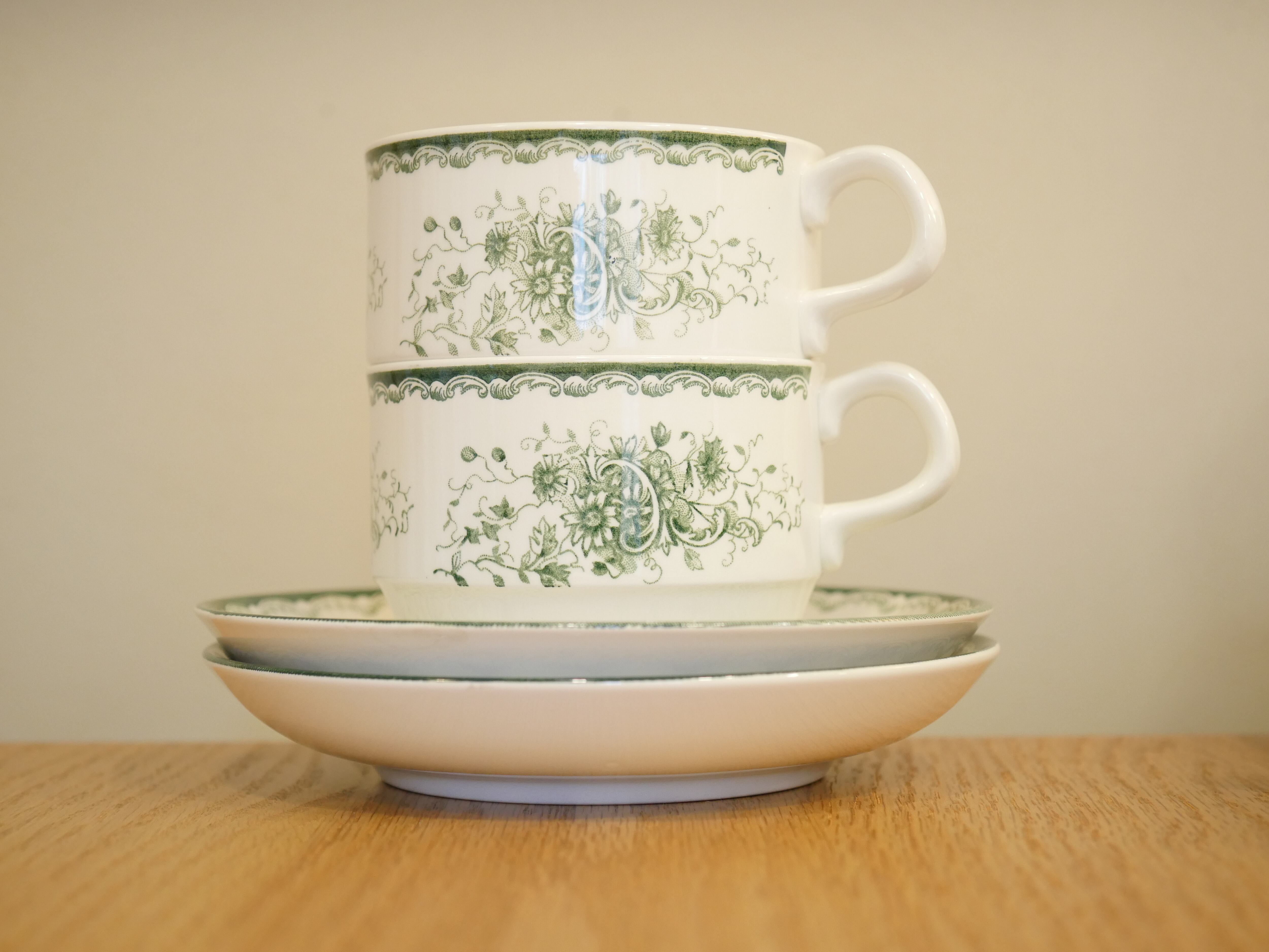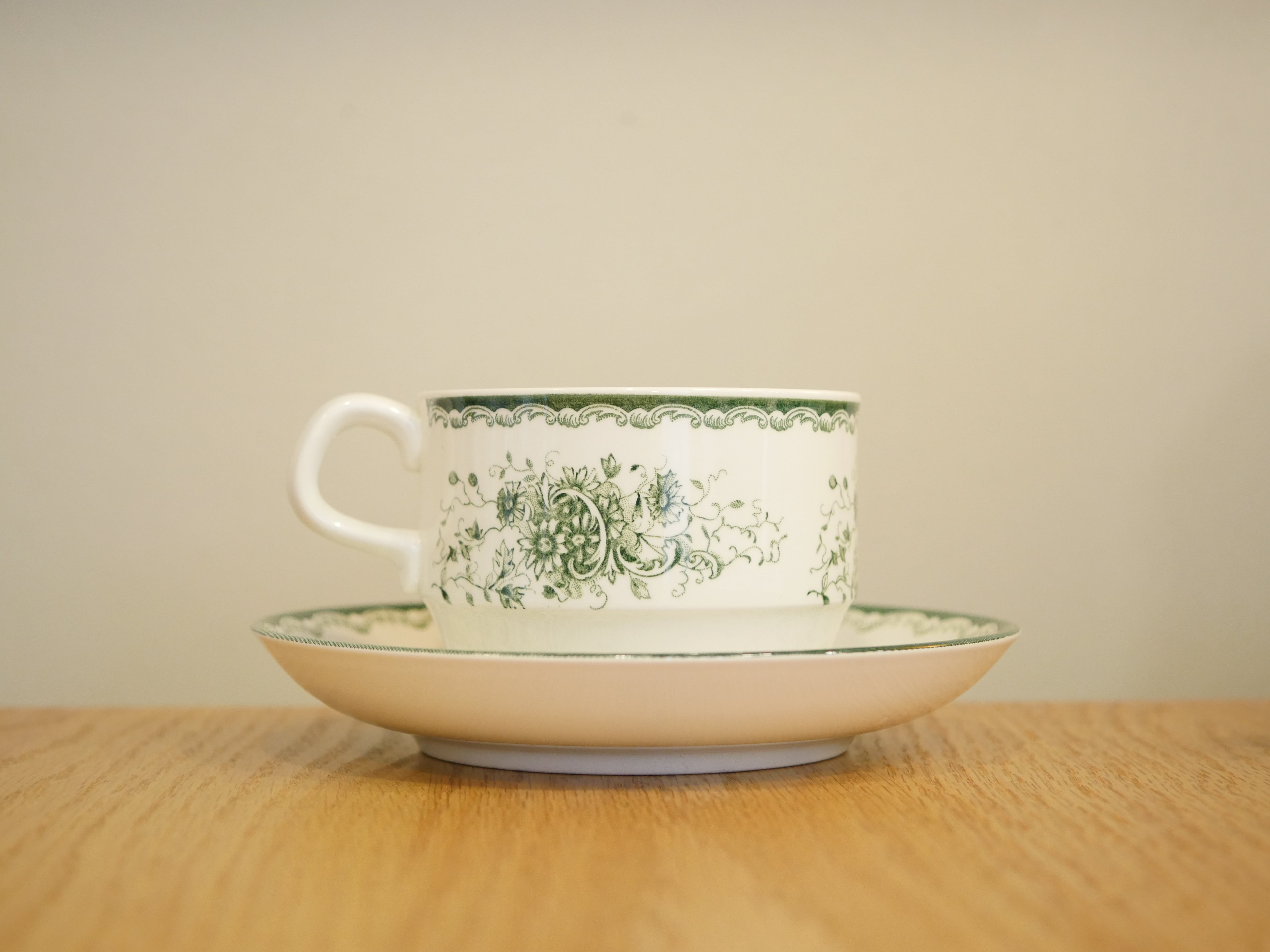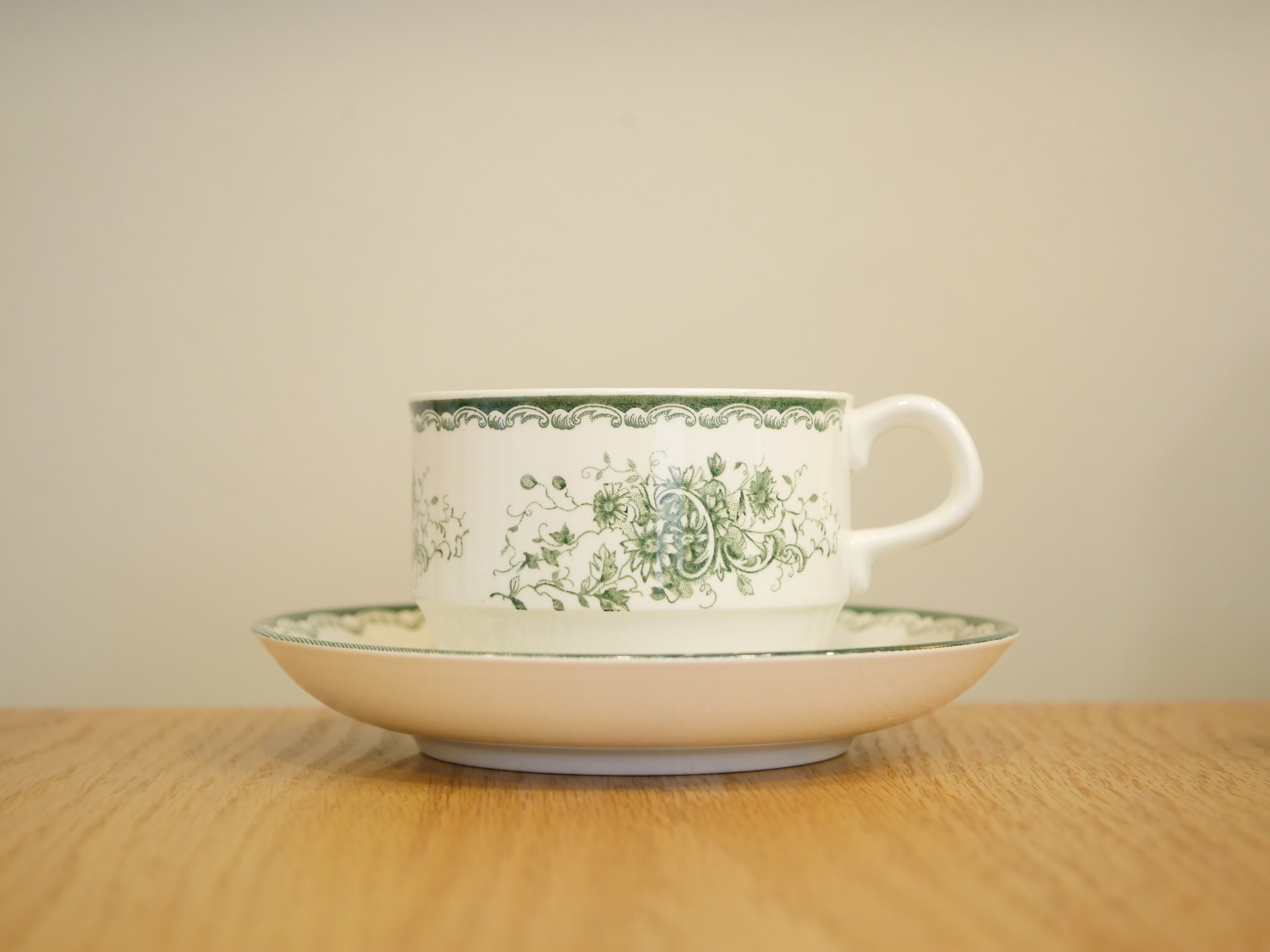 Gron Annaは1898-2002年と休止期間を途中2回挟みますが非常に長くスウェーデンの人に愛されたデザインです。オフホワイトにグリーンの装飾。カラーリングはシンプルですが、クラシカルで繊細な植物や花のデコレーションがカップにもソーサーにも満遍なく施され、女性的で上品なデザインです。こちらはティーカップサイズと容量大きく、同型であれば綺麗にスタッキングも可能です。バックスタンプにVDN(消費者センターのようなもの)とあり、こちらのマークは使用した期間が1951−1973年の間なのでこのカップもその時に作られたものだと思われます。