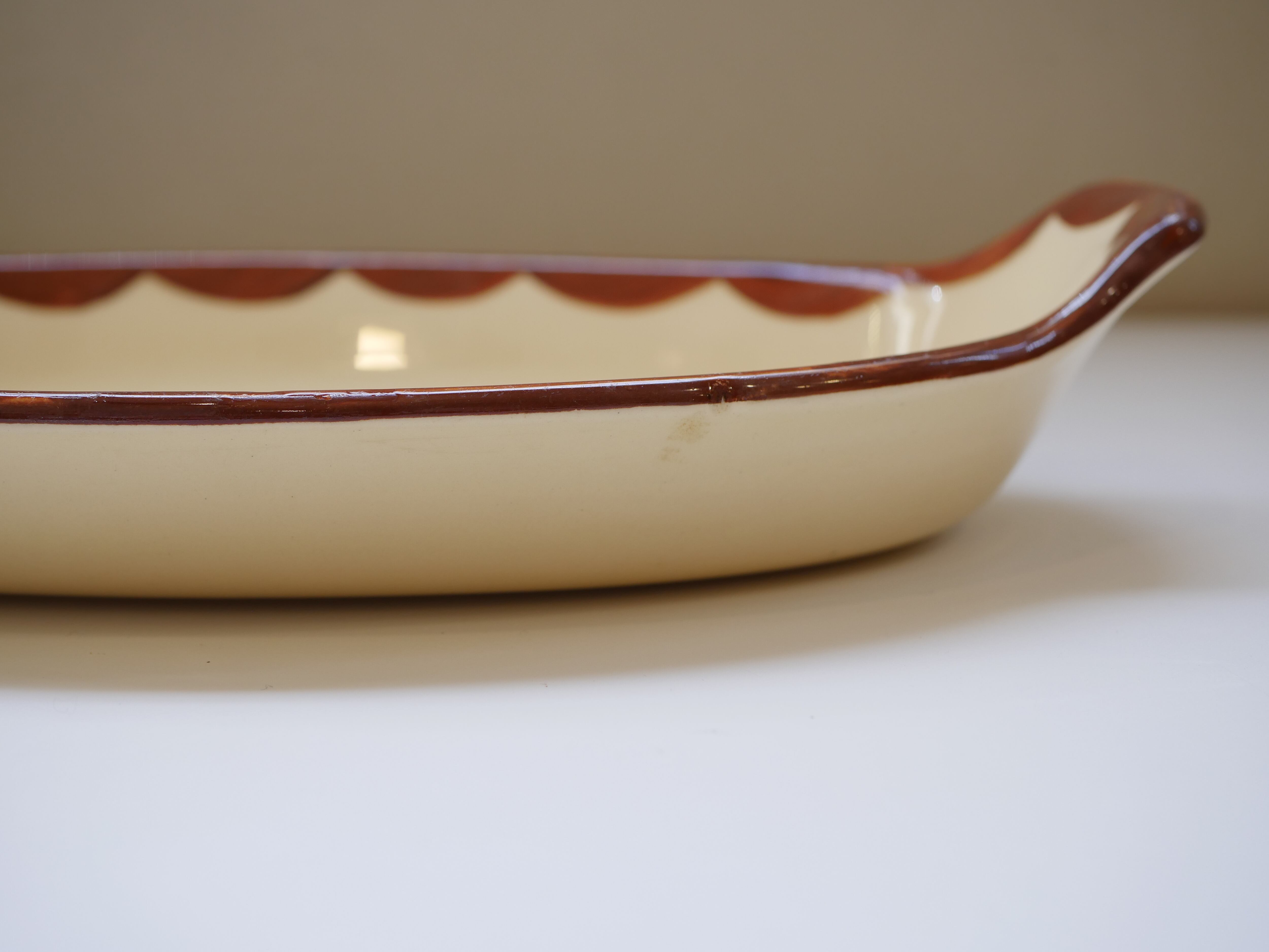 ピューロは1930年にストックホルム博覧会で発表された、グスタフスベリ初のオーブン対応シリーズです。古いシリーズなのでコンディションが良いものが少なくなってきています。レトロなタッチのブラウンがレース模様に全周に描かれていて、柔らかいベージュをベースとしたお皿はどこか懐かしく感じます。こちらは北欧食器では珍しいオーバル形です。