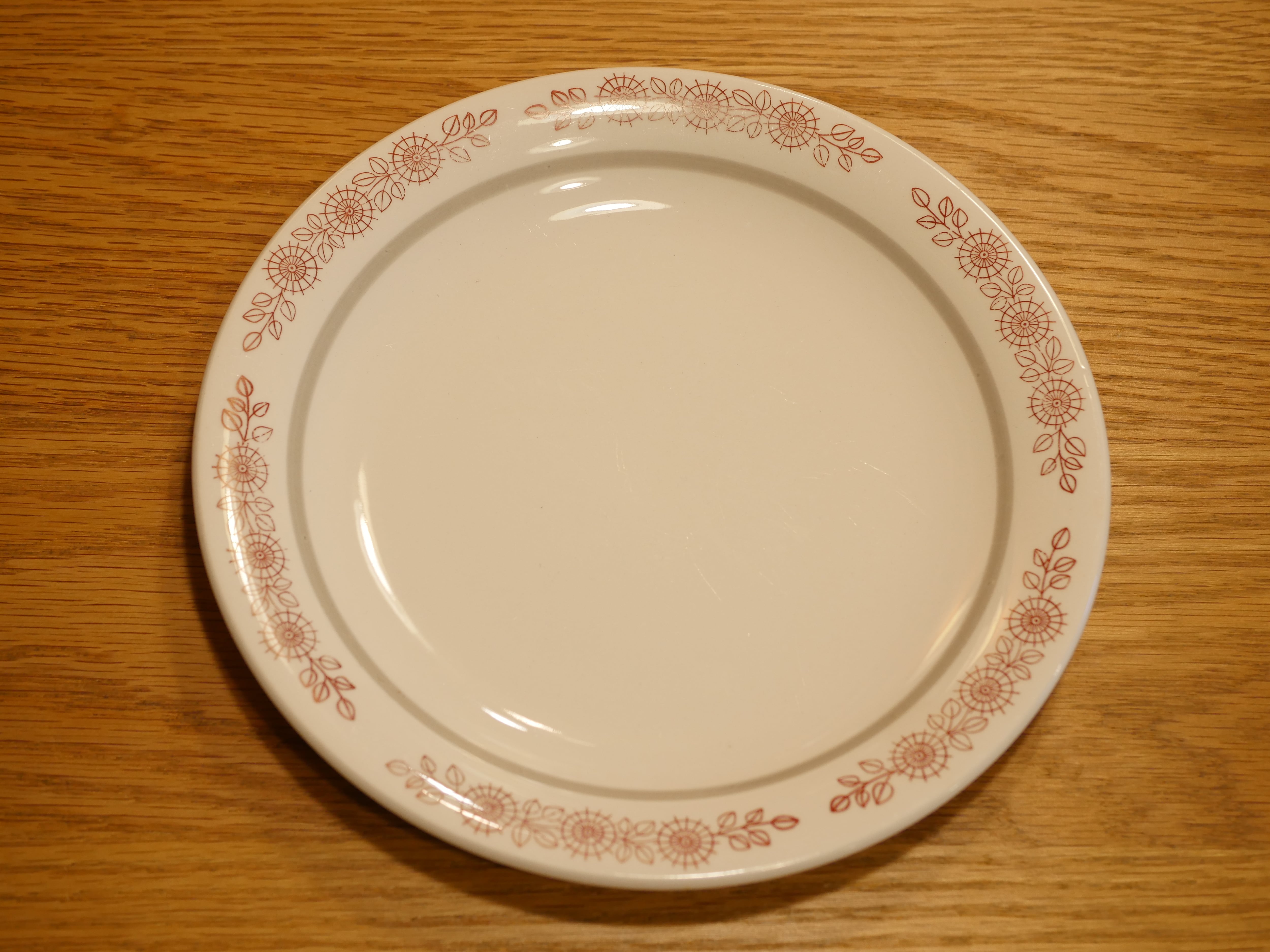 茜色の細いラインで描かれた草花をハンドペイントの透け感のある柔らかいグレーのラインが包みこんでいます。丸みのあるフォルムが可愛く、リム部分も滑らかに。シンプルながら触り心地も含め優しい印象を受けます。真ん中にお菓子を載せると惹きたつデザインです。