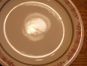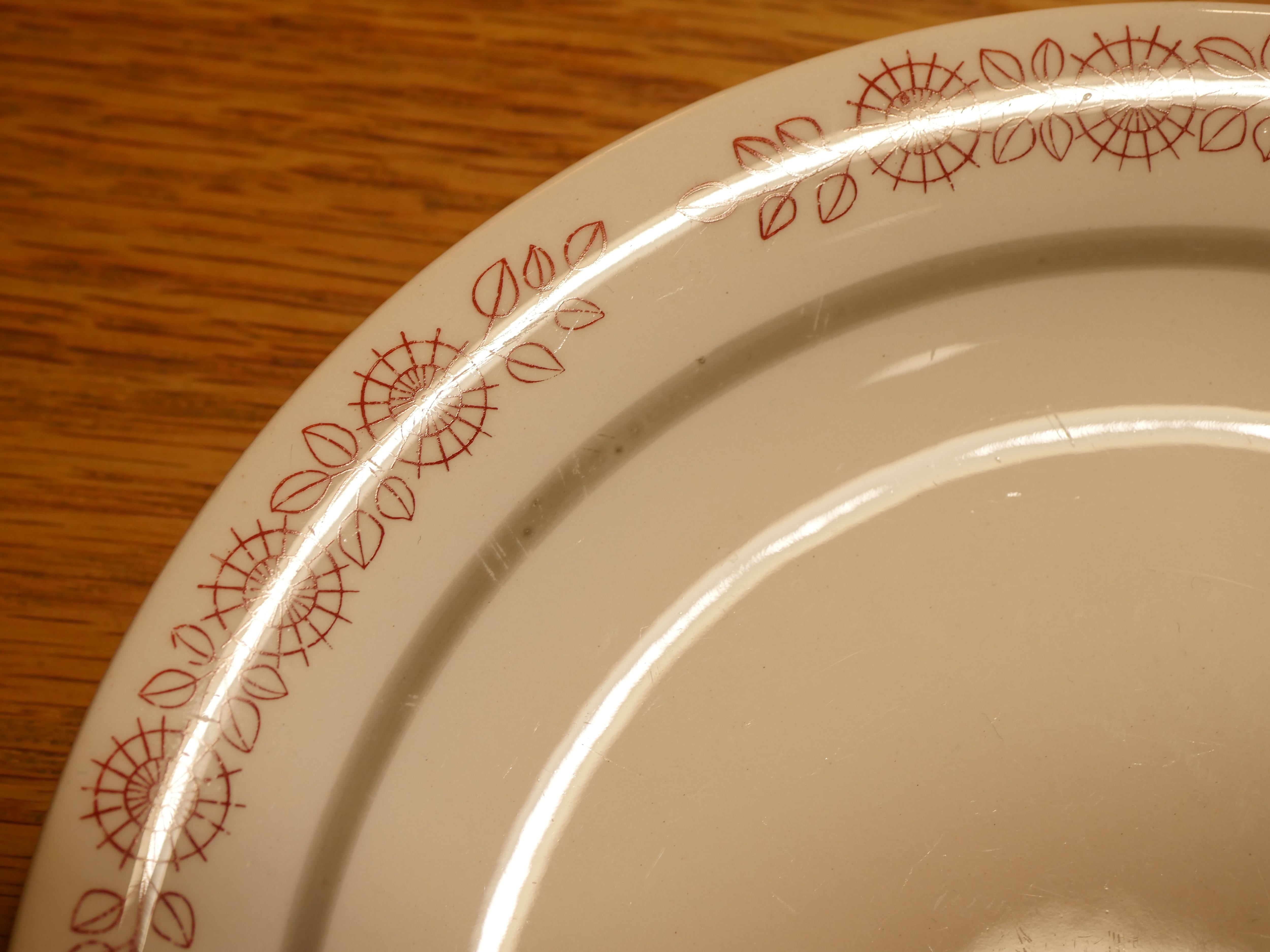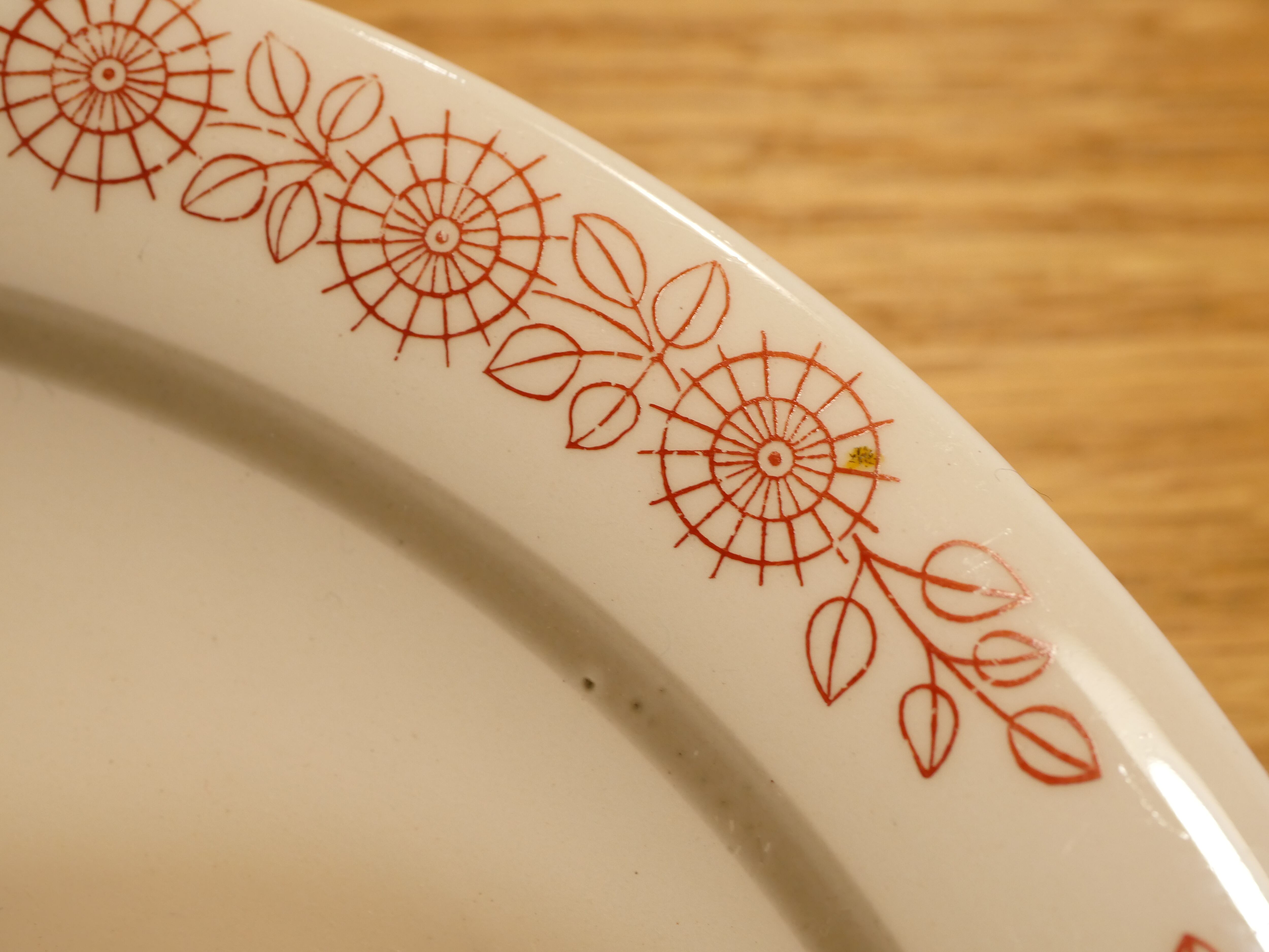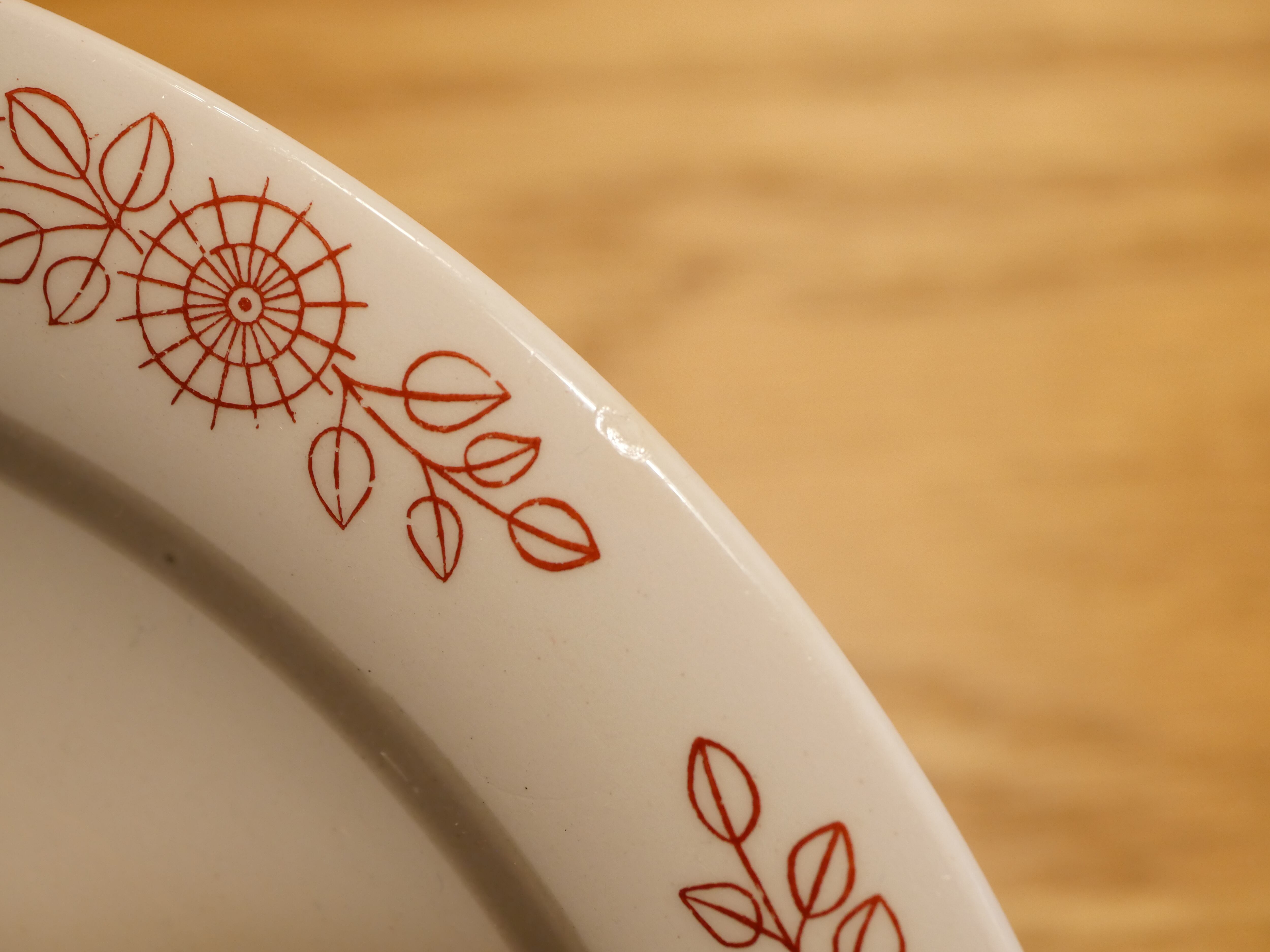 茜色の細いラインで描かれた草花をハンドペイントの透け感のある柔らかいグレーのラインが包みこんでいます。丸みのあるフォルムが可愛く、リム部分も滑らかに。シンプルながら触り心地も含め優しい印象を受けます。真ん中にお菓子を載せると惹きたつデザインです。