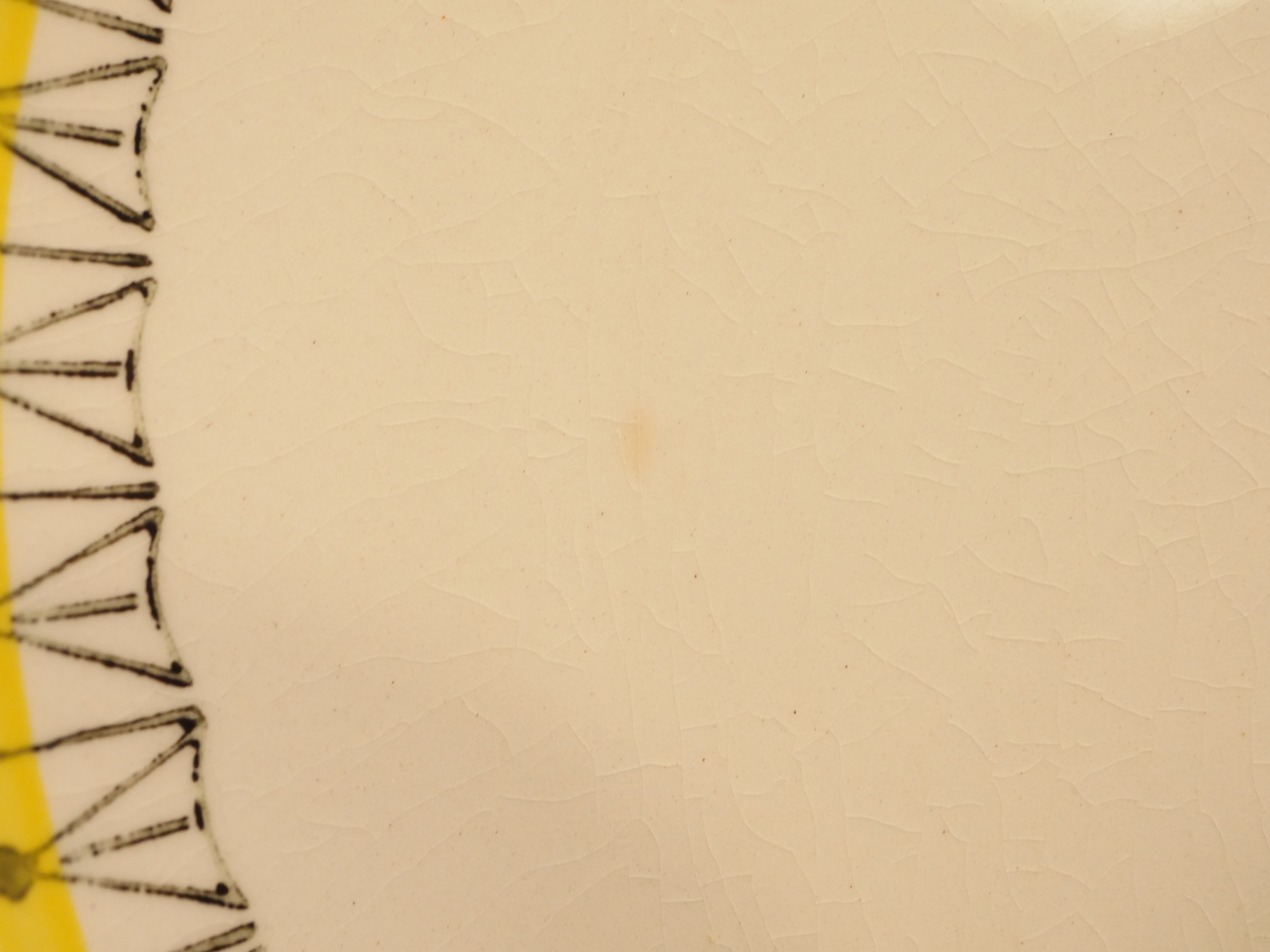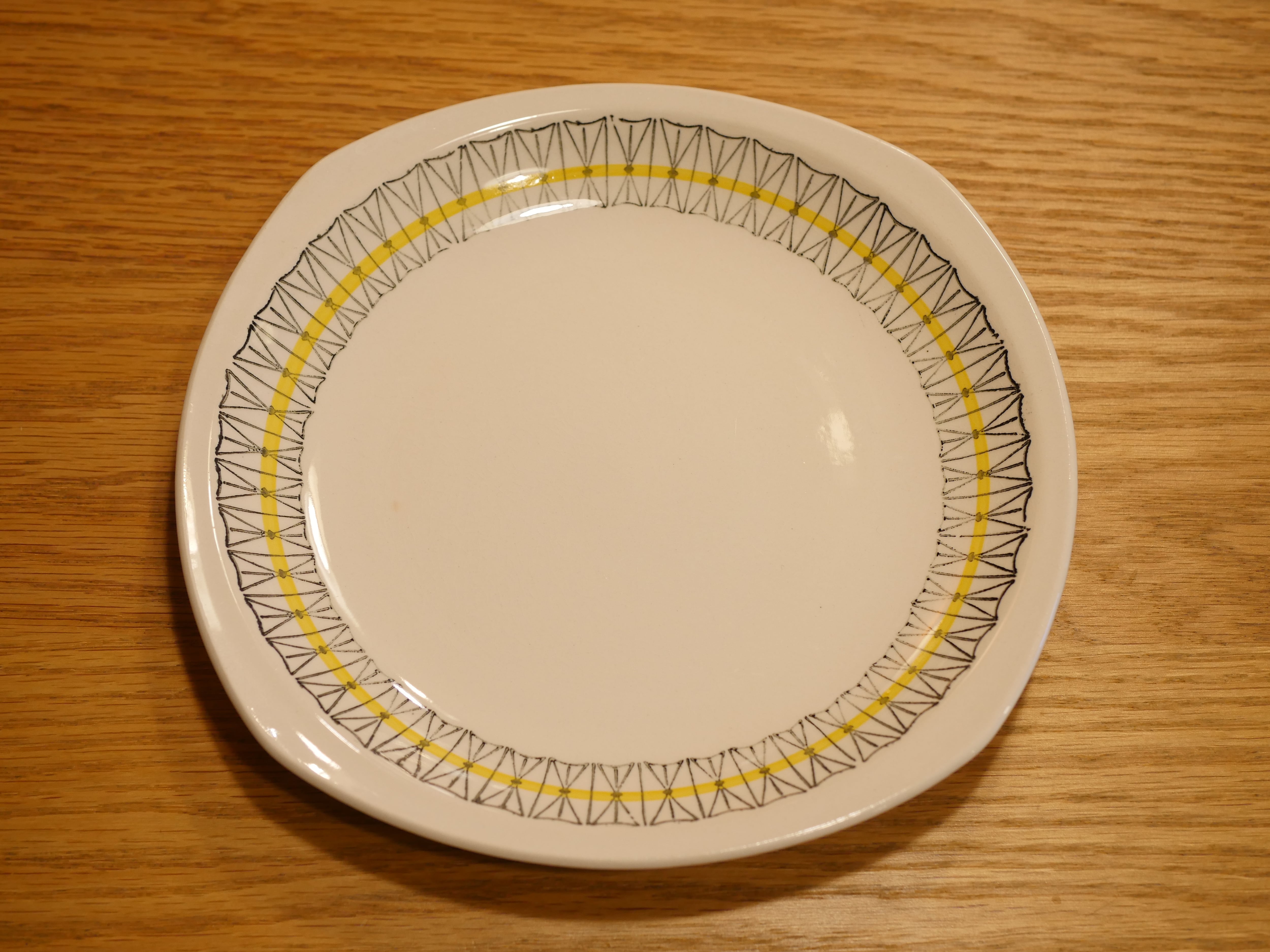 このシリーズは同型のものを5枚重ねても高さが出ず、薄くスタッキングしやすいデザインになっています。幾何学模様はヘルマー・リングストロームによるもの。黄色のラインが明るい食卓を演出してくれることでしょう。