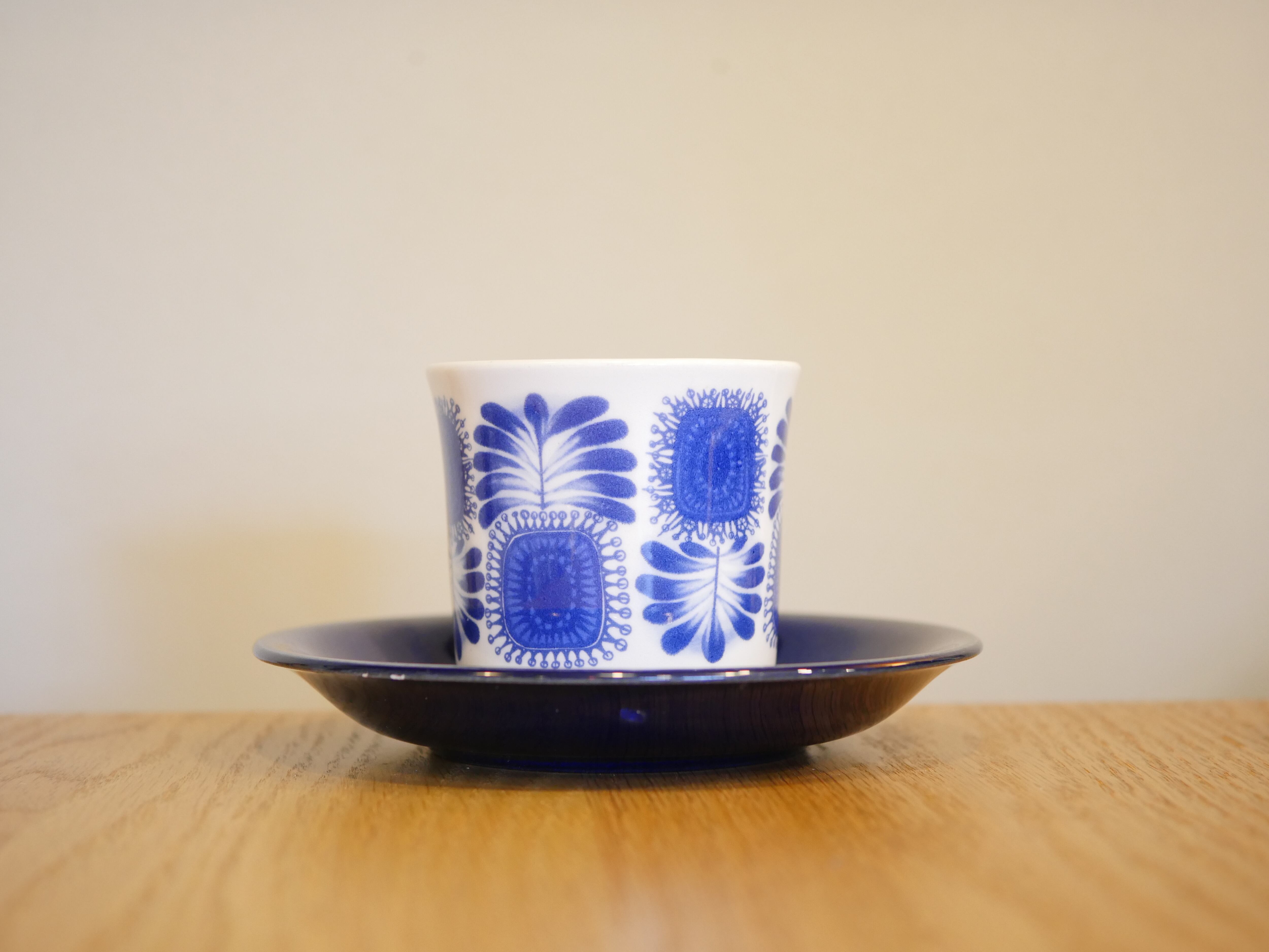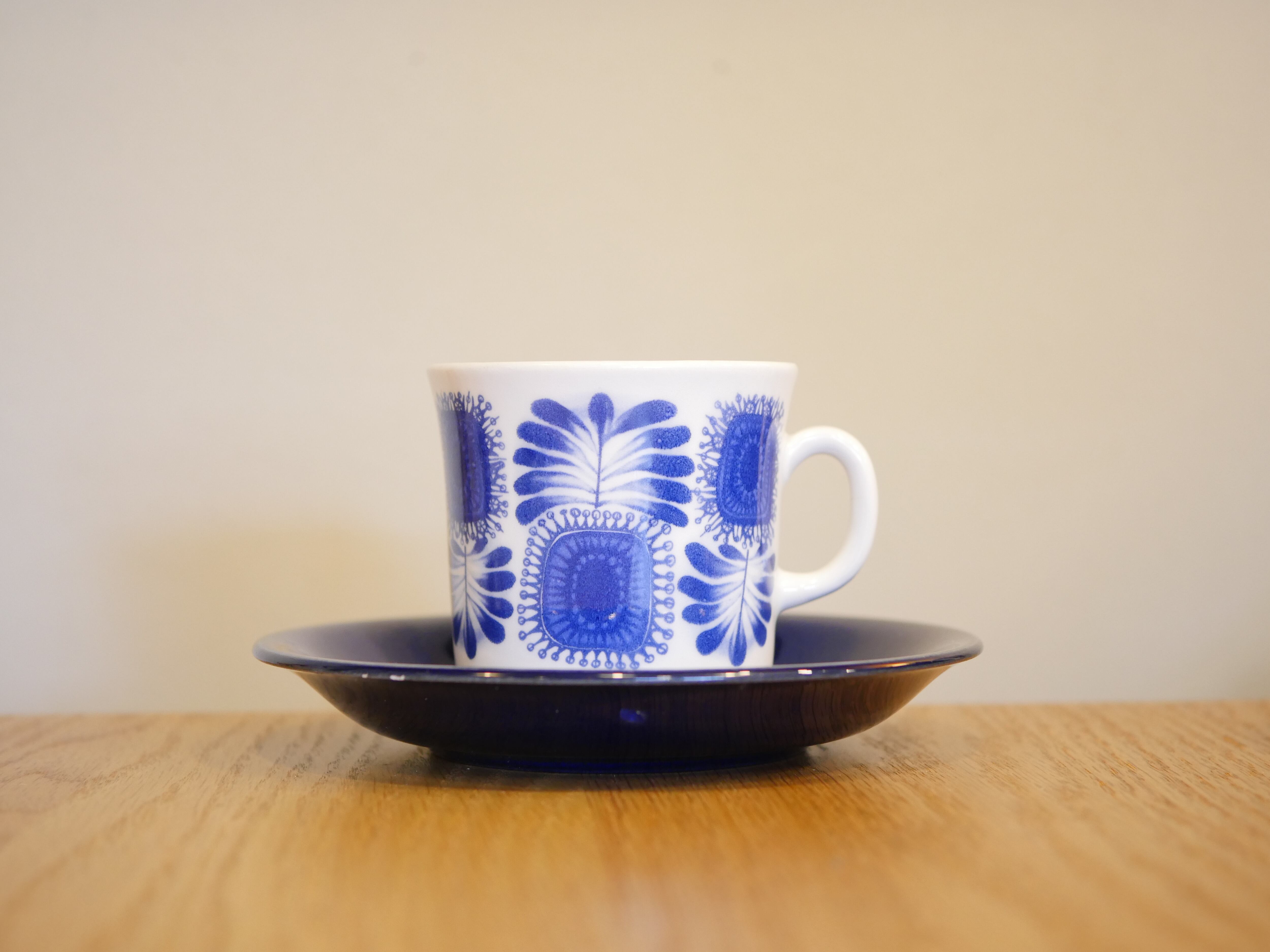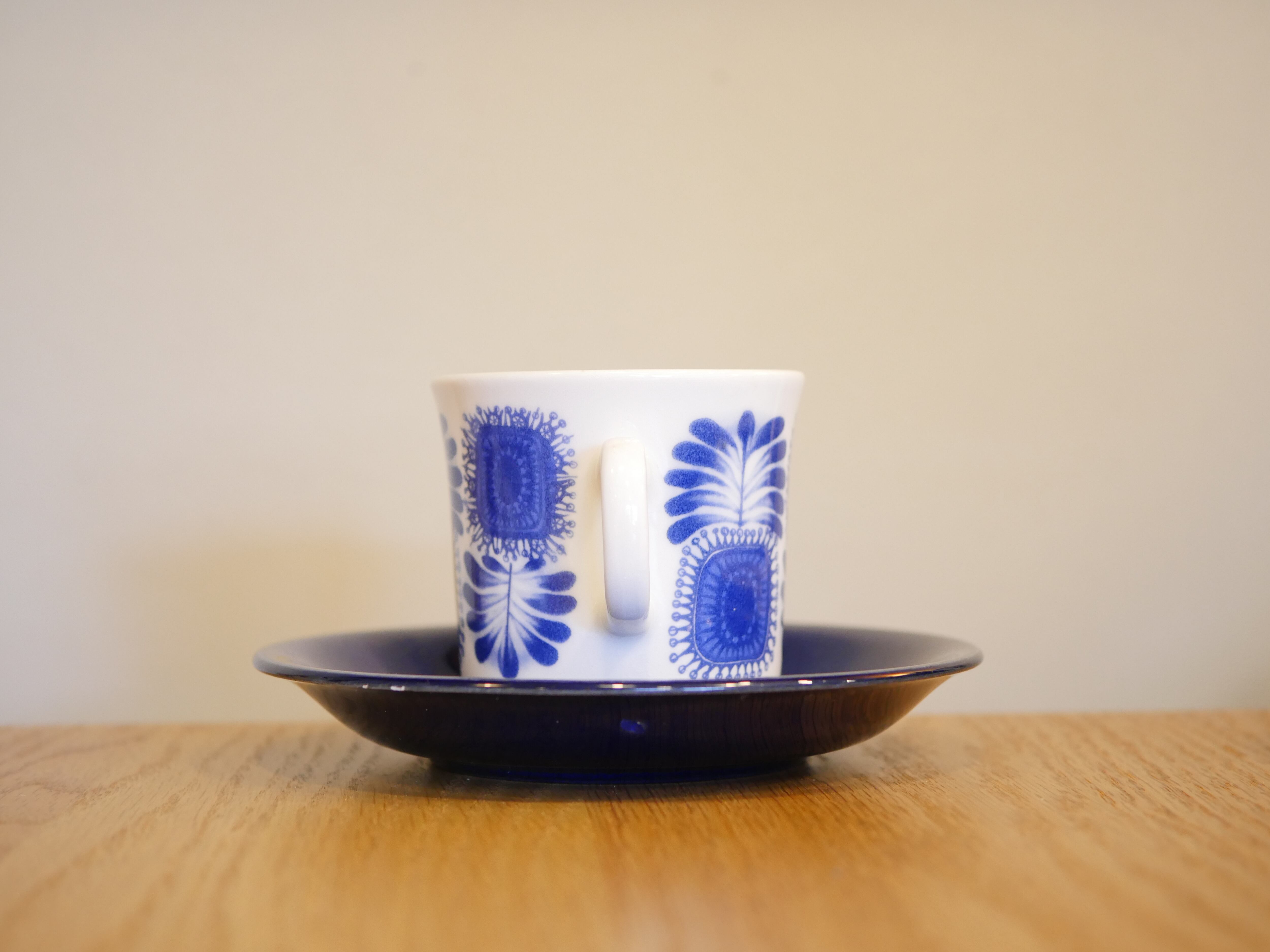 今は製造されていないGefle社のLagunです。白地のカップに大輪の花もようが上下交互に配置され満遍なくデコレートされています。ソーサーは無地ですがまるで海のように深い藍色で、落ち着いた色ながらダリアのような鮮やかな存在感で食卓を演出してくれるでしょう。