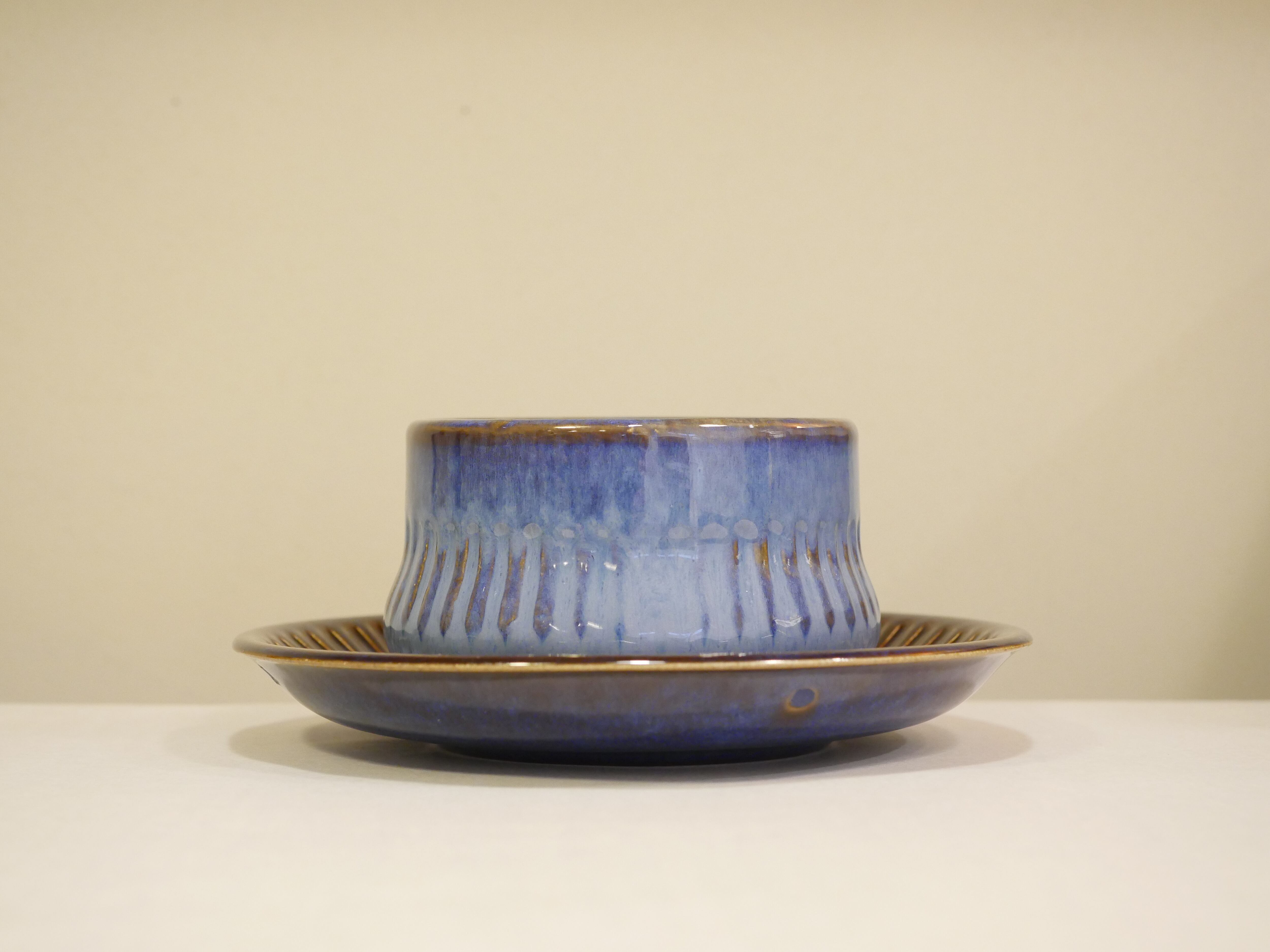 神秘的な深みのある青の釉薬は1つ1つ色の濃淡が違く、思わず魅入ってしまう美しさがあります。また、このころんと丸みを帯びたフォルムは手に優しくおさまります。飲み物だけでなく、スープにも良さそうです。1967年にはオランダ・ユトレヒトの国際展示会で優勝した理由がわかるゲフレの名作シリーズです。