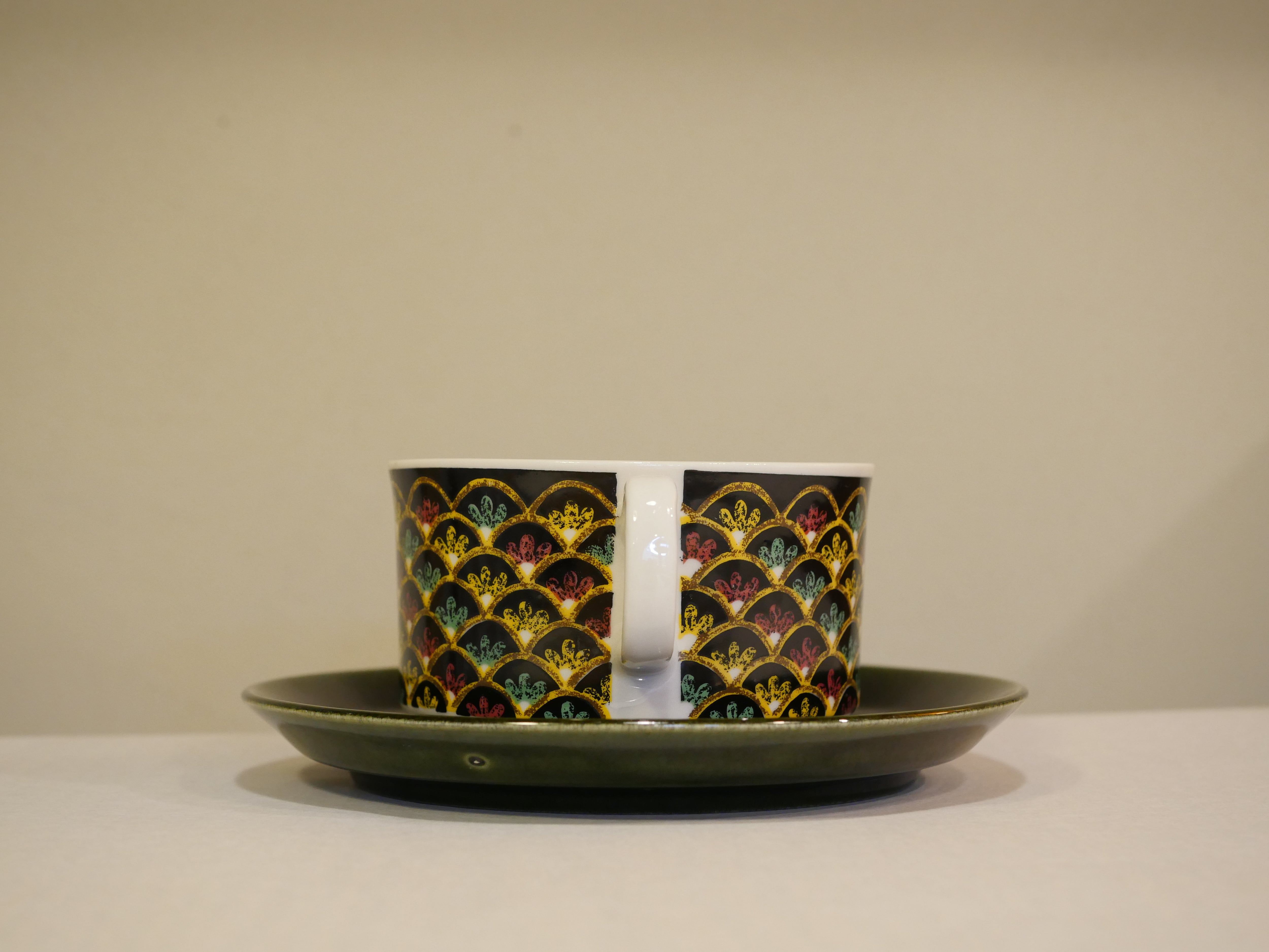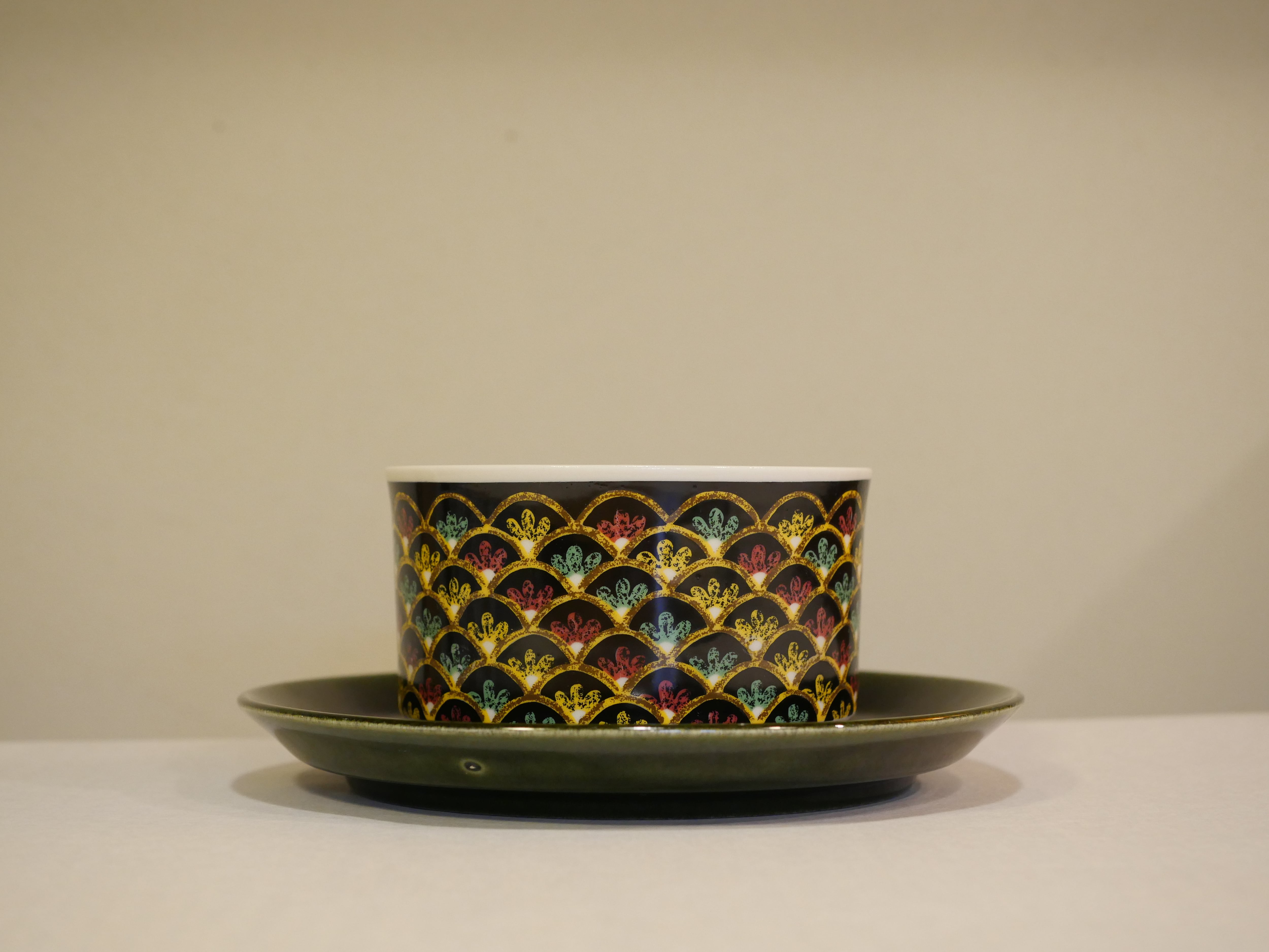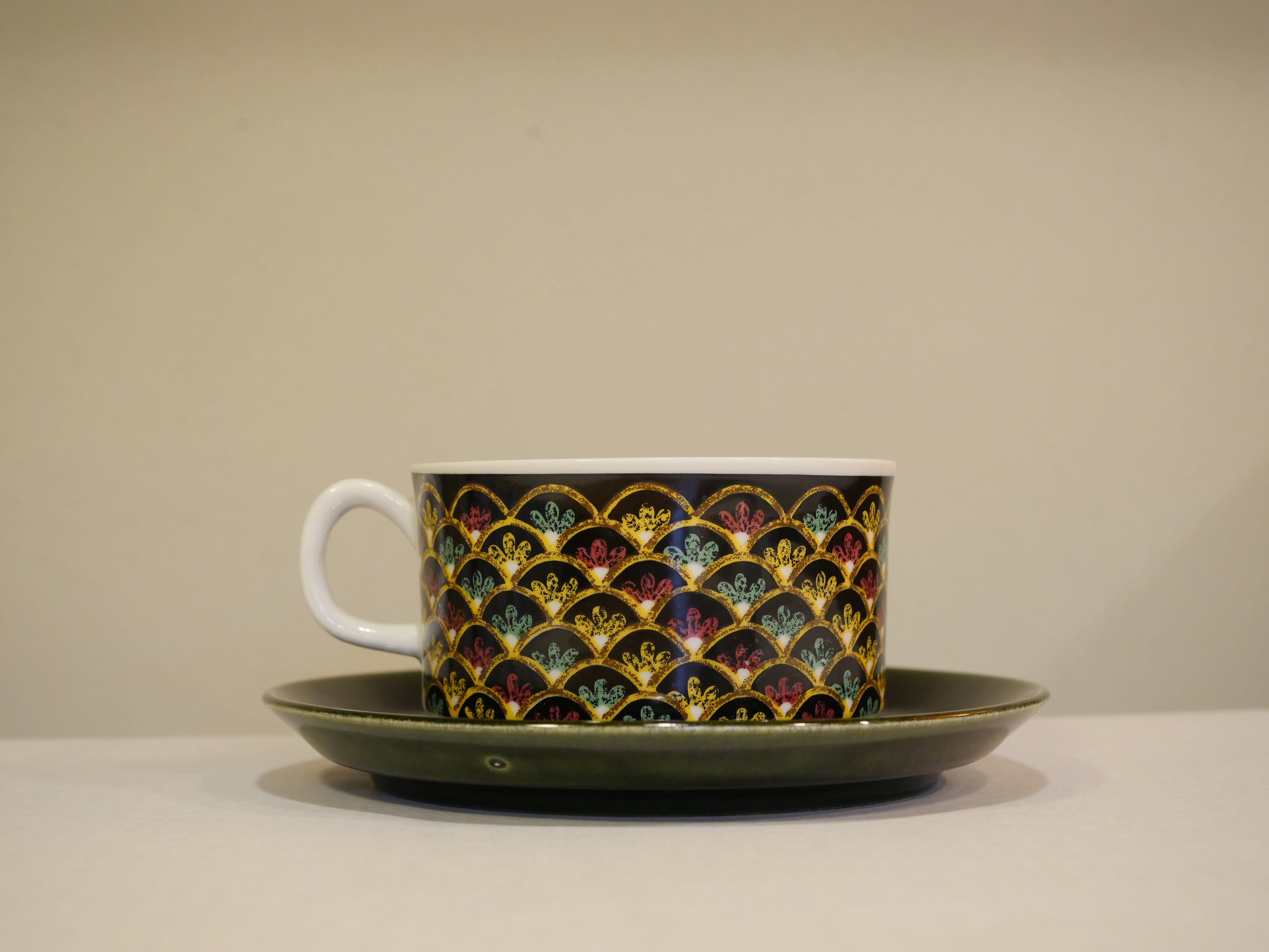 一見するとよくある北欧のデザインとは異なる印象を受けるこちらのシリーズ。ARABIAにも同名のシリーズがありますが、遠く離れ、気候やイスラムの影響を色濃く残した文化は北欧とは異なり憧れを抱くことがあったのでしょうか。黒をベースにしたカップには色艶やかな彩色で描かれ、深い緑色のソーサーが、よりシックに魅せてくれます。こちらは大きめのティーカップサイズです。