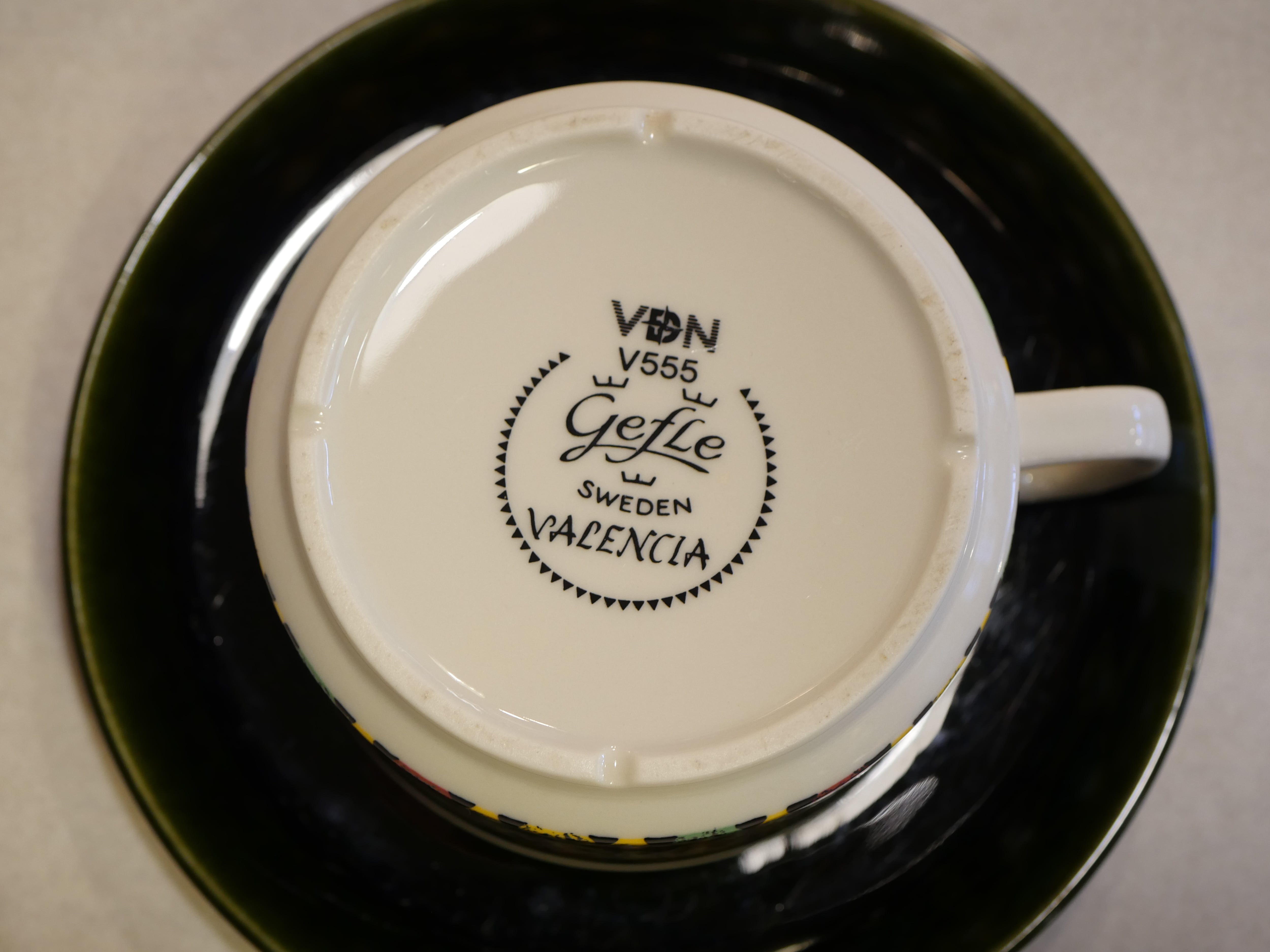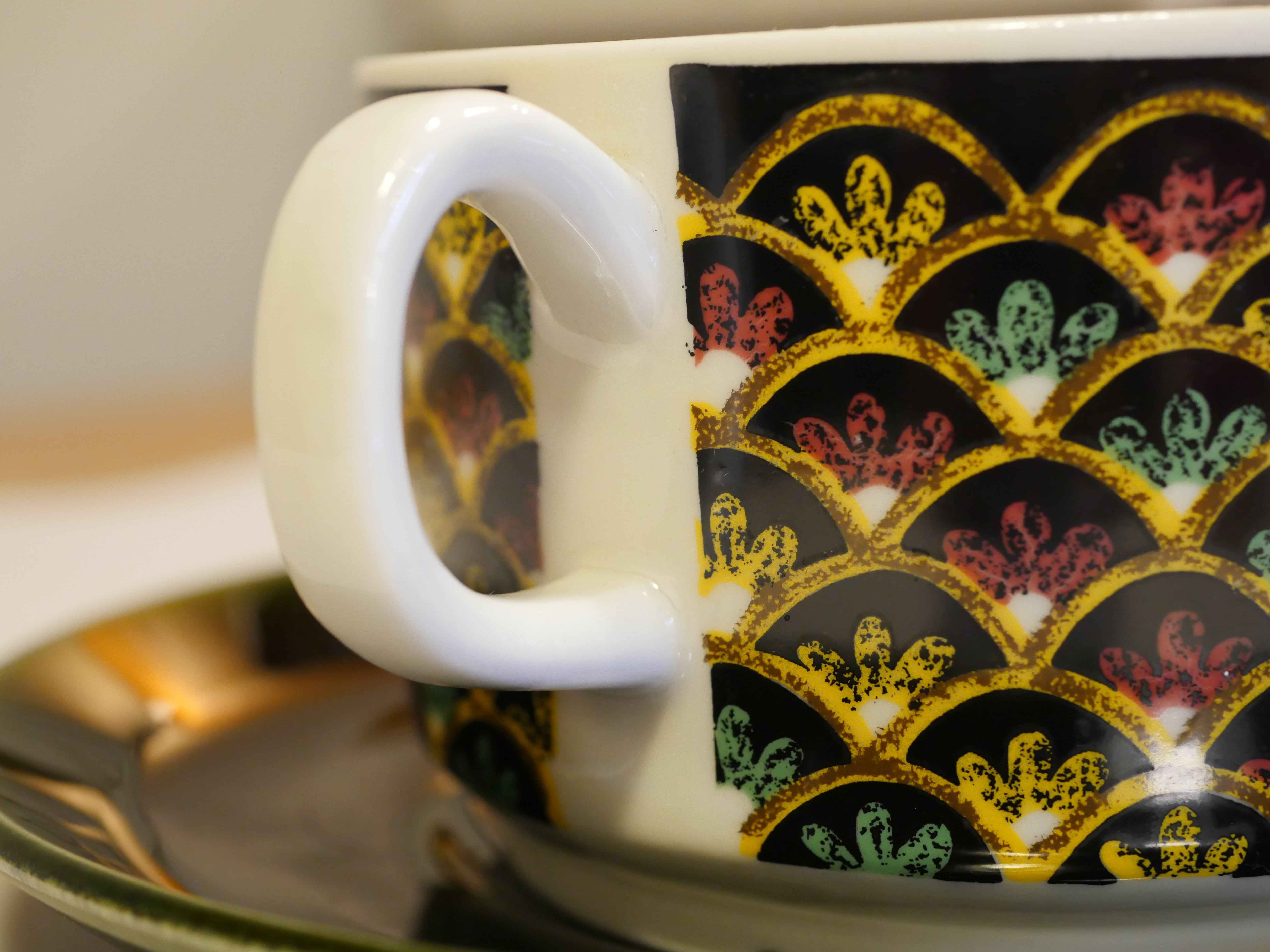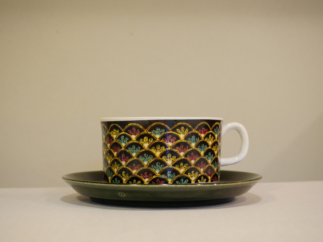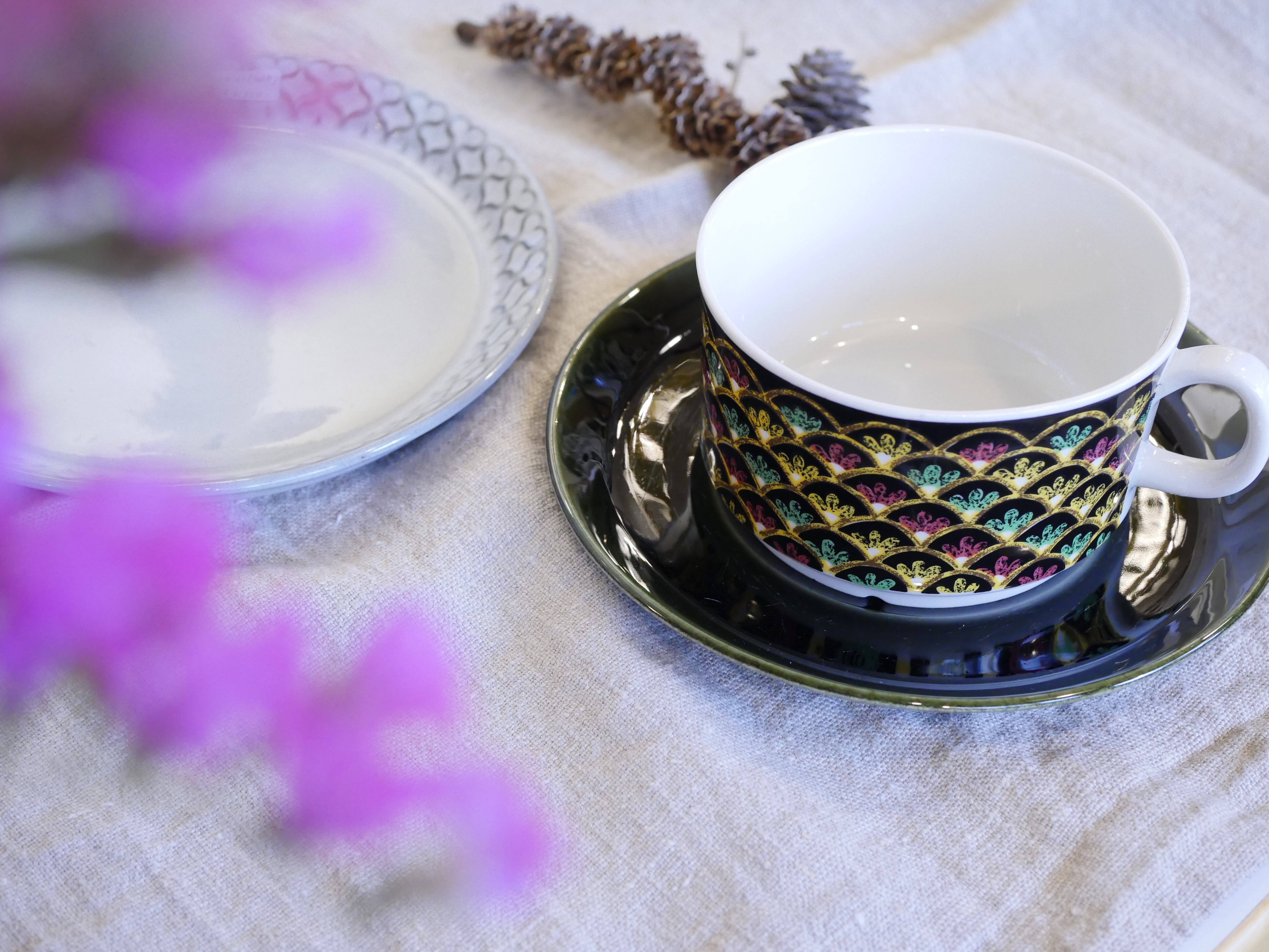 一見するとよくある北欧のデザインとは異なる印象を受けるこちらのシリーズ。ARABIAにも同名のシリーズがありますが、遠く離れ、気候やイスラムの影響を色濃く残した文化は北欧とは異なり憧れを抱くことがあったのでしょうか。黒をベースにしたカップには色艶やかな彩色で描かれ、深い緑色のソーサーが、よりシックに魅せてくれます。こちらは大きめのティーカップサイズです。