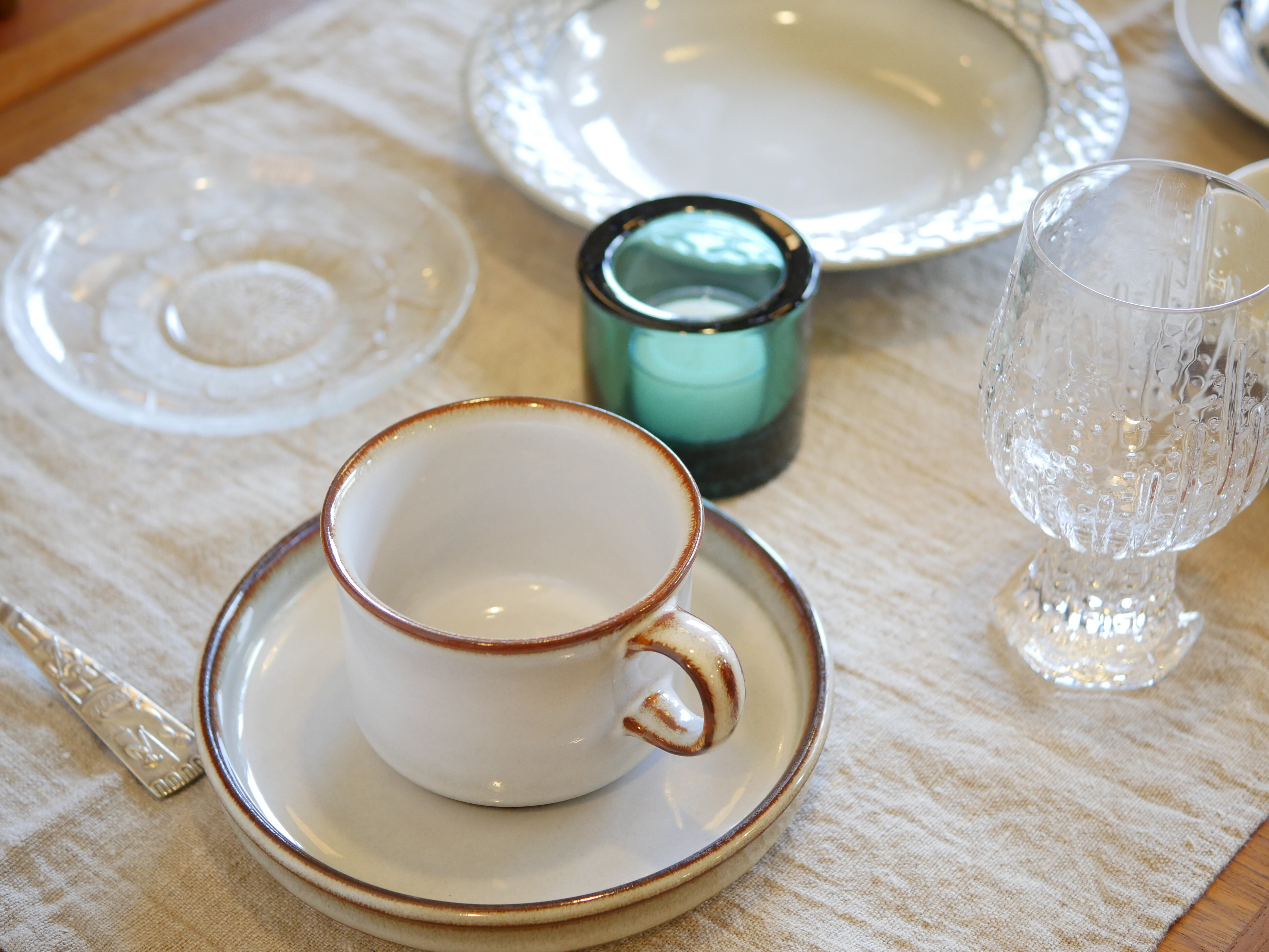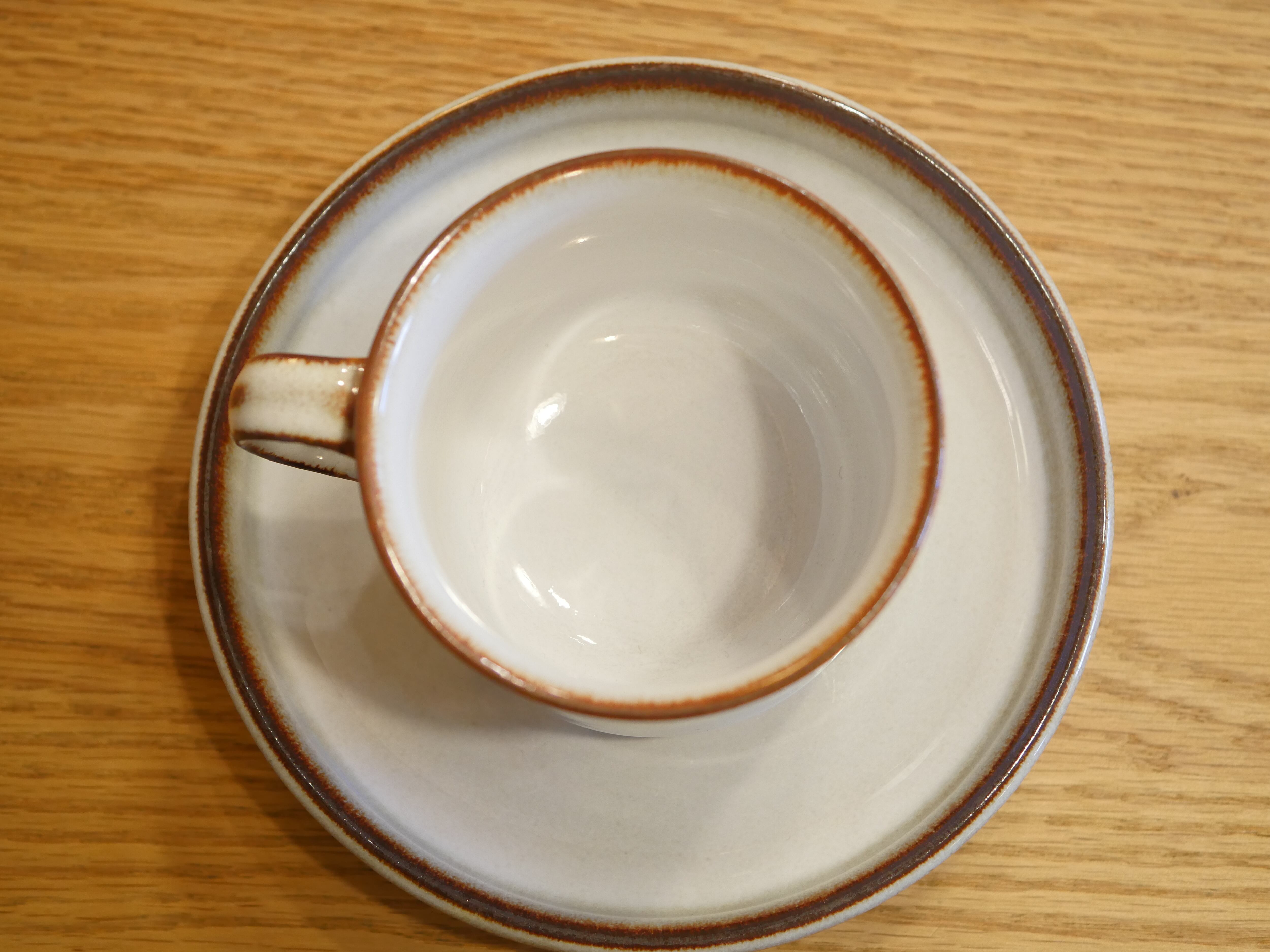 スーホルムのソニヤシリーズです。デンマークらしいライトグレーをベースに飴色のようなブラウンの釉薬が優しく落ち着いた雰囲気を醸しています。ソーサーはずっしりとしたつくりで、縁がしっかり立ち上がっている形状です。サイドに小さなお菓子を並べてコーヒーを飲むのに最適です。