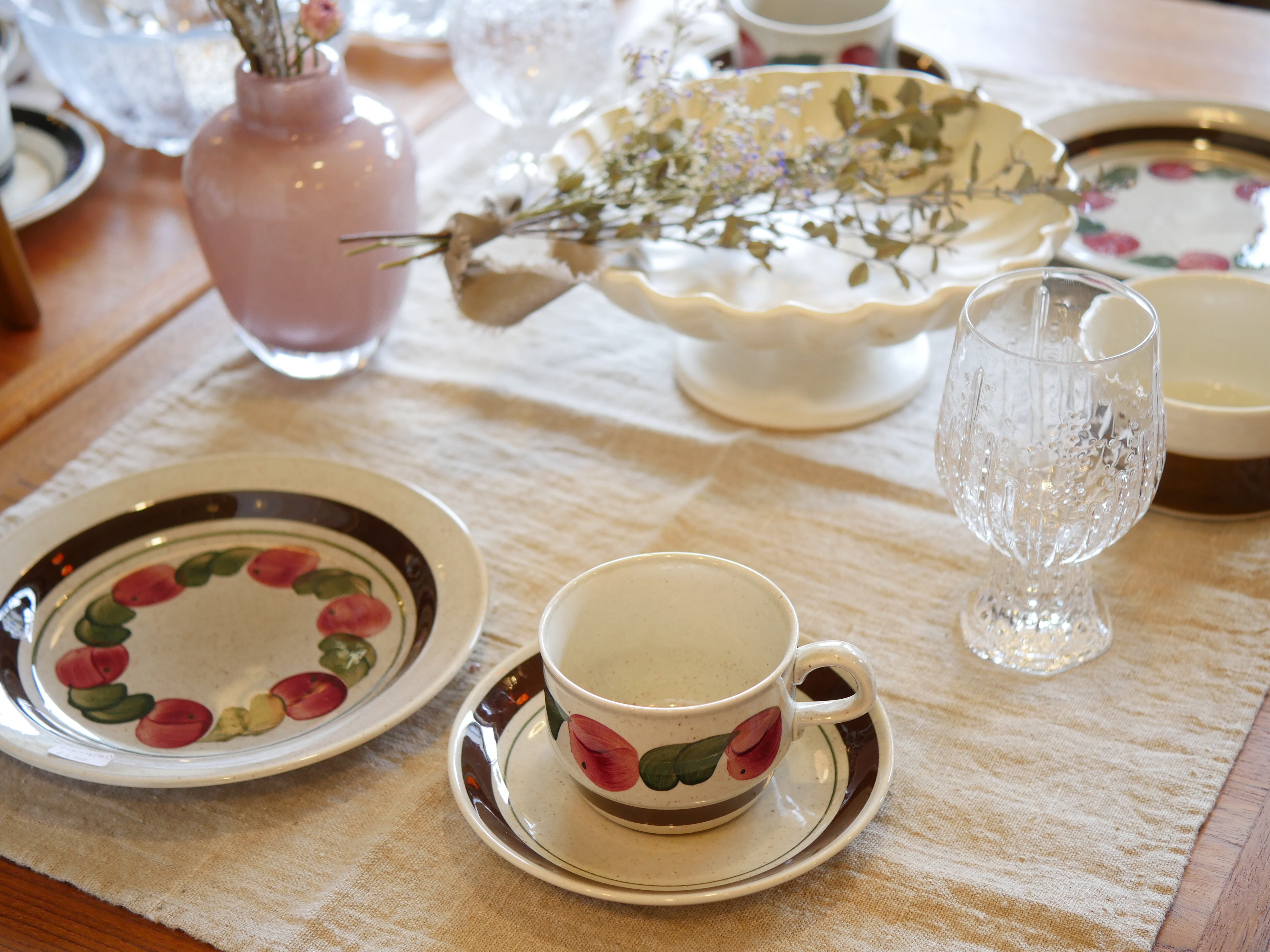 「Birgitta」とはスウェーデンの女性の名前で、プラムのような色の実は女性らしさを感じさせます。筆の刷毛目や色の濃淡が美しく、柔らかい雰囲気をよく醸し出しています。裏面には「HANDMALAD(=ハンドペイント)」の文字も。薄いグレージュの素地には、茶点を無数に散りばめて素朴さも演出。1枚で食卓を可愛らしく演出する人気シリーズです。