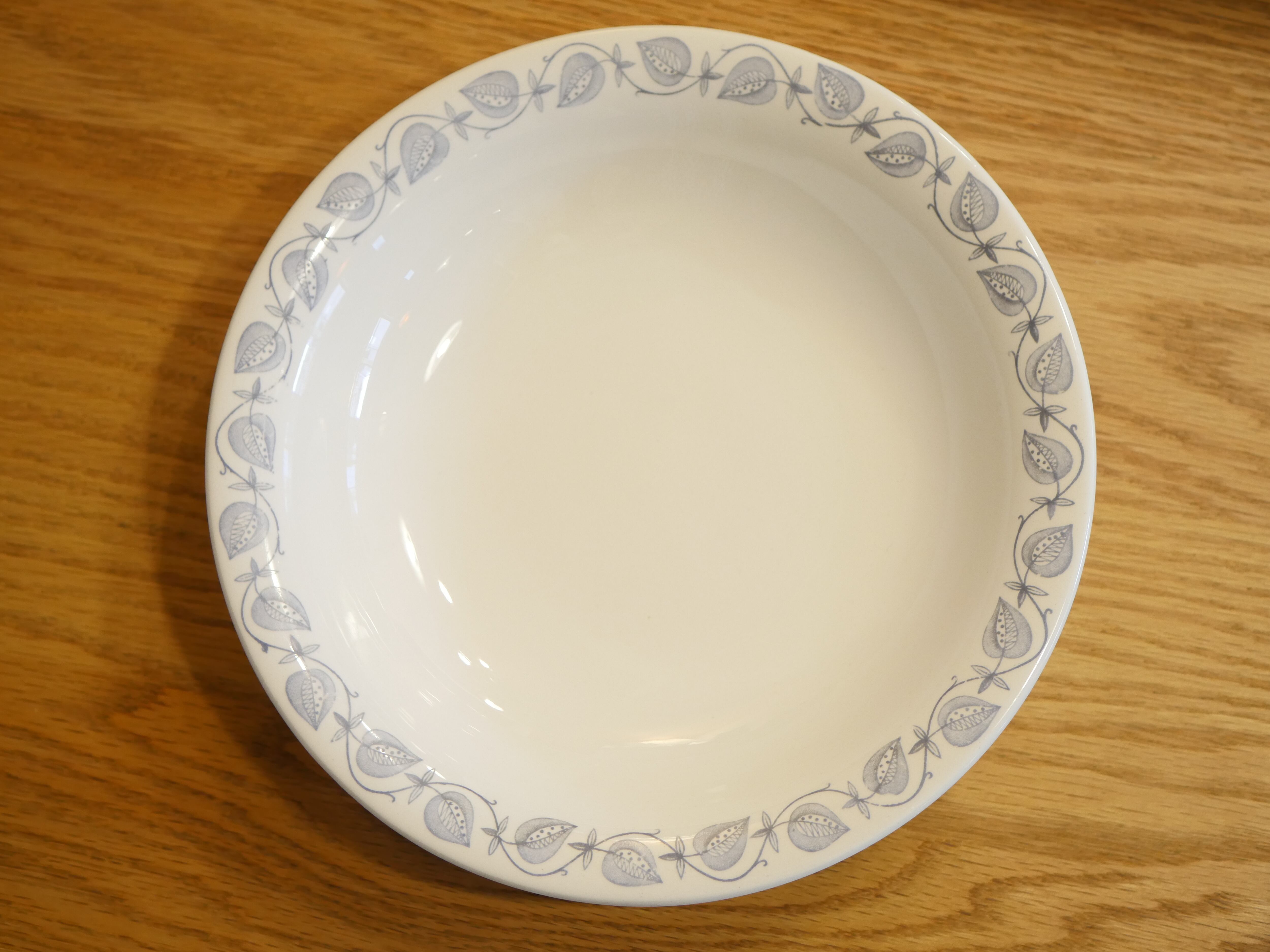 オフホワイトに植物の実が淡いブルーグレーで描かれています。丸みのあるフォルムが可愛く、リム部分も滑らかに。バックスタンプはイラスト入りで遊び心があります。スコーンやマフィンなどの焼き菓子やグリーンサラダなどがよく合いそうです。